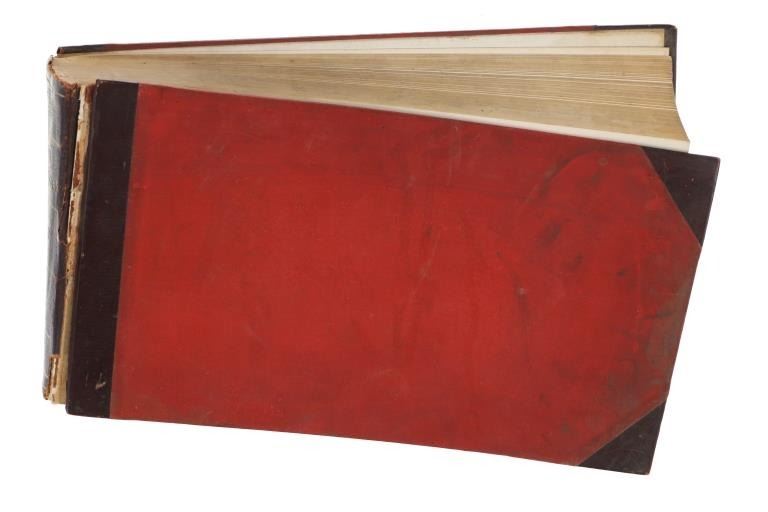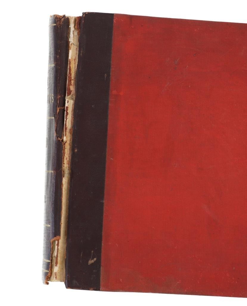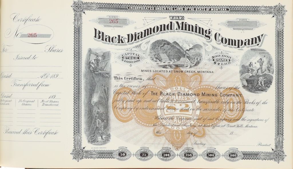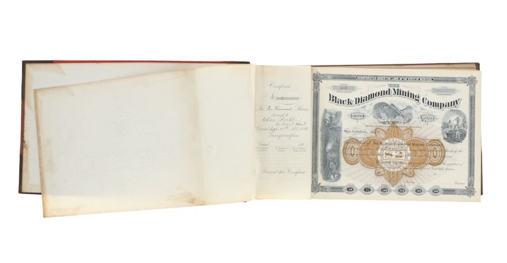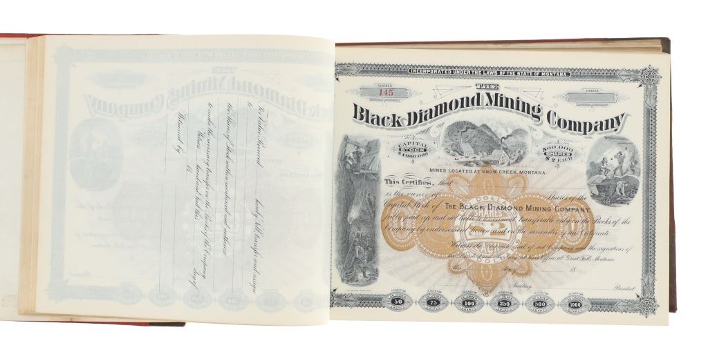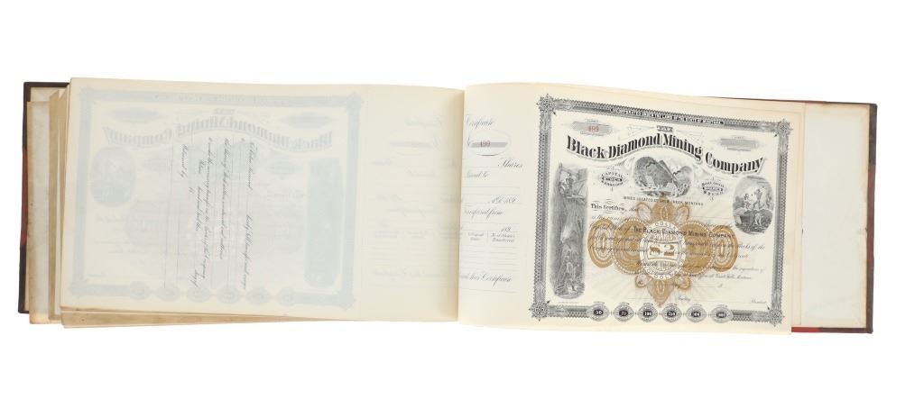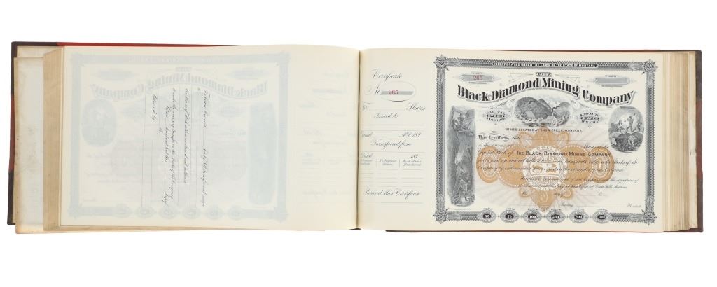 Stock certificates have front face illustrations of mining operations and of the mining camps, a gold gilt emblem is surrounded by the illustrations. "Black Diamond Mining Company Mines Located at Snow Creek, Montana". is printed at the top, "incorporated under the laws of the state of Montana" is printed inside the upper decorative border. The leather / red cloth bound hardcover stock certificate book exhibits damage to spine hinges, scuffing noted to cover edges, soiling. Intact certificates and stubs exhibit age tanning and slight foxing. Book measures 8.5"W x 15.25"L x 1.5"D