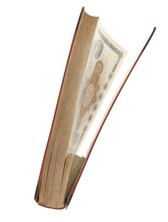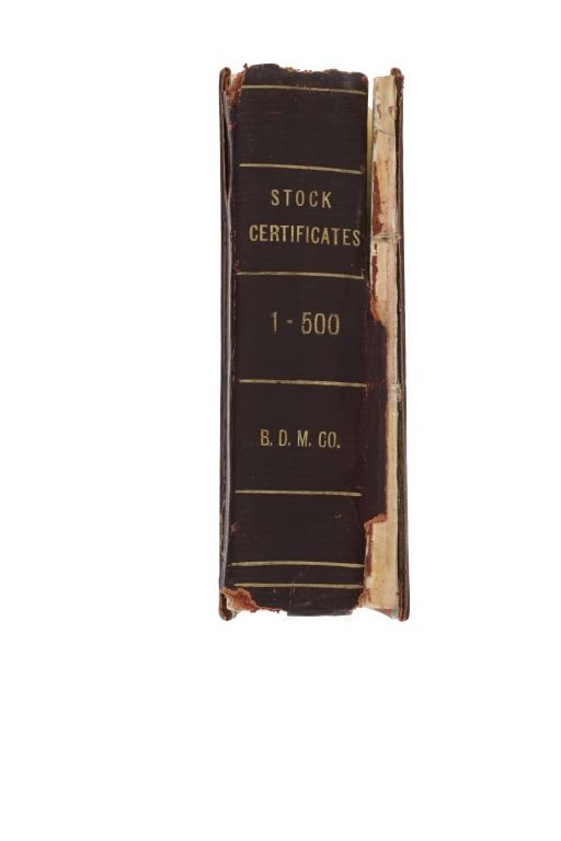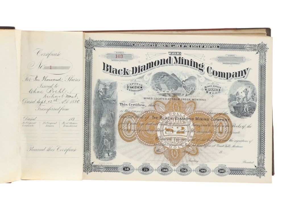 Presented in this lot is a Scarce Black Diamond Mining Company, Snow Creek, Montana Stock Certificate Book. The Black Diamond Mining Company was located in the mining area of Neihart, Montana. Rich veins of silver were mined in the Historic Neihart Mining District for a fifty-year period beginning in July 1881. Remnants of the first claim, the Queen of the Hills mine, are located just a few hundred yards north of where you are standing. During the peak of silver mining here (late 1800s and early 1900s), the Silver Dyke Mine was one of the world’s largest producers of silver ore. J. L. Neihart helped discover the district and soon founded the town bearing his name. In 1891, the Belt Mountain branch of the Great Northern Railroad was constructed, connecting Neihart to the Anaconda Company smelter at Great Falls. The line remained in operation until 1945. At one time, Neihart had fourteen saloons in one block, all of them located on the same side of the street. Respectable stores were located on the opposite side, and ladies never crossed over. By 1887 most of the richest and easy-to-reach veins of ore had been exhausted. By 1890, Neihart was almost deserted. In 1891, a spur of the Montana Central Railway reached Neihart, and a strong mining boom began. Neihart went through a series of booms and busts over the next half-century. Portions of Neihart have been abandoned, and ghost town ruins can be seen in the city's outer limits. Stock certificate book includes ninety-nine (#1-#99) issued certificate stubs, #100-#102 stubs were not recorded, #103-#499 certificates are unissued. #1-#39 were all issued on September 12, 1890, last recorded certificate was issued October 20, 1892. Stationer stamp located on inside cover, "John Morris Company, Stationers, Job Printers, Blank Book Manufacturers and Lithographers, Nos. 118 and 120 Monroe Street, Chicago, Job No. C14808 Ordered 8/26 1890. When another Book like this is wanted, it will be only necessary to send the above number and date. Order Duplicate Of This Book Three Months Before Wanted. To Prevent Warping Keep Under Weights Two Weeks. Books Should Season Three Months Before Using."