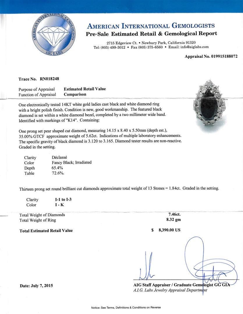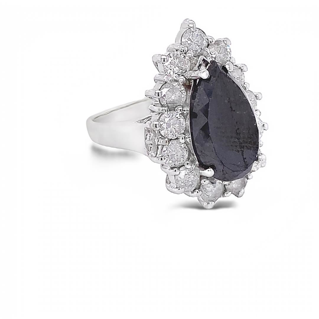 Black Diamond Ring. Please see Photos and Description for all available information. The pear-shaped black diamond, also known as the "Heart of Eternity," is a symbol of eternal love. The 5.62ct black diamond is surrounded by a 1.84ct white diamond halo and framed with a 14K white gold band.