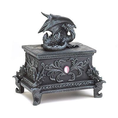 Black Dragon Treasure Box **|**|** Worthy trinkets and treasures will be protected by this fearsome dragon. Whatever you keep in this intricately carved box, it will be guarded by a resting dragon on top and four fierce dragon faces at each corner of the base, surrounded by braided detail, medieval flourishes, and highlighted by two oblong pink jewels. Item weight: 2.6 lbs. 7-1/4 x 5-3/4" x 8" high. Polyresin. ."