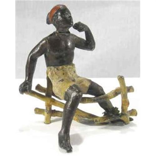 The figure of a man is sitting on a fence. The head appears to have been reattached although it moves from left to right. This figure will stand alone. There is a tiny piece of metal under his right foot that indicates he may have been joined to another piece. He has a red bandana on his head, his shorts are cream.