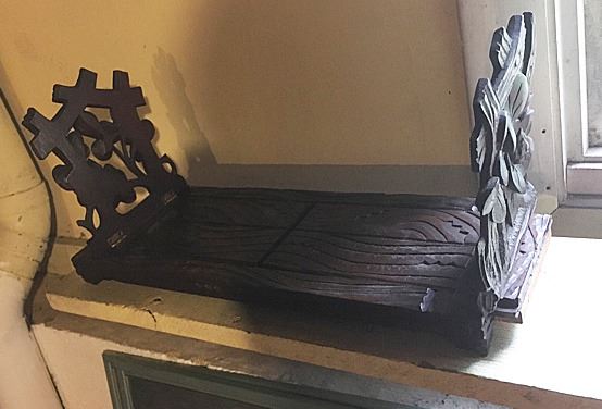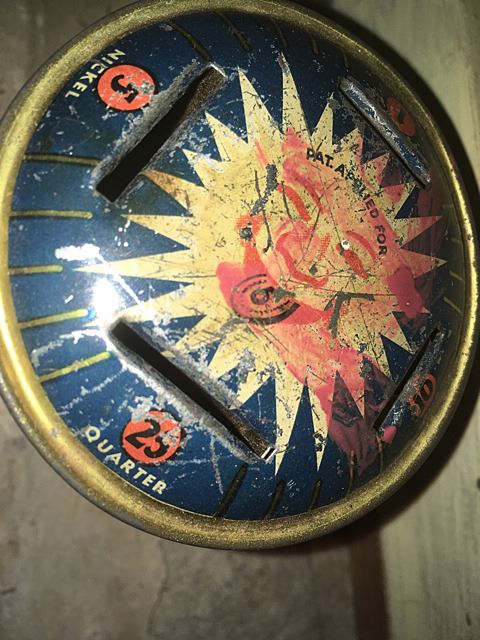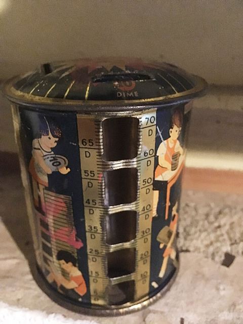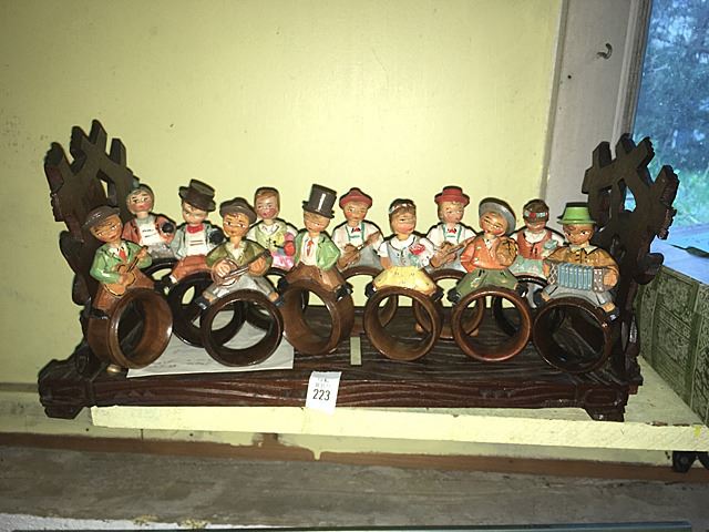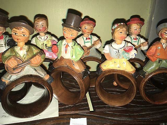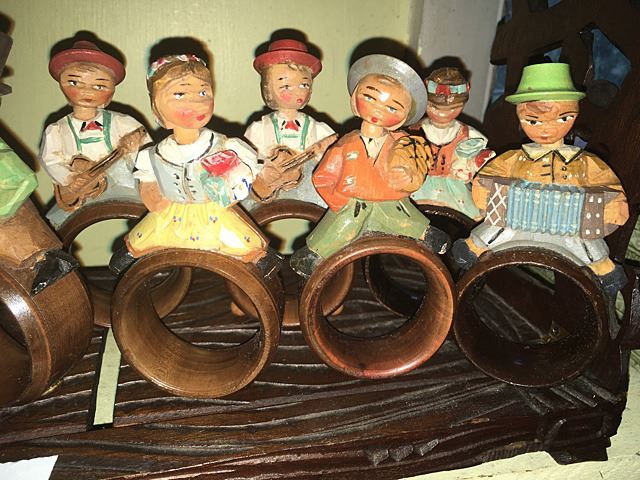 Black Forest collapsible book ends, set of hand carved napkin rings purchased in Lucerne, Switzerland August, 1969 and more in August 1982. Each napkin ring has nice, hand carved Black Forest figure. Vintage tin bank.