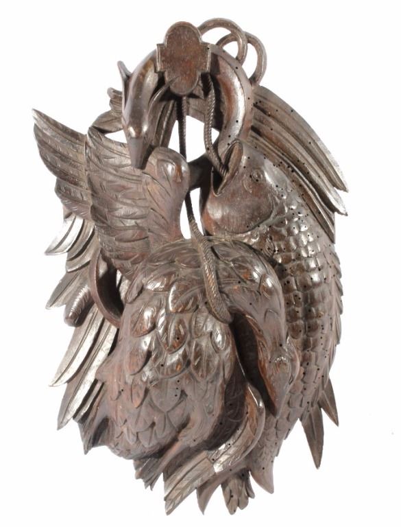 This is an exceedingly rare original beautifully hand carved Black Forest hunting or game plaque. The piece is German carved and is from the 18th to 19th century. The piece shows excellent detailed carving with a rich original dark coloring. The plaque shows a small game bird, fish, and eel with a continuing rope and top unmarked tag. The piece very good condition with no apparent breaks or cracks. Measures 13.5"H x 8.75"W and 2 5/8" thick or deep.