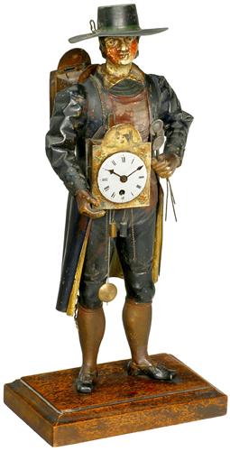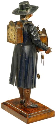 Black Forest Clockman, c. 1870 Hand-colored tin figure on wooden base, 38 cm/15 in. high, carrying two black forest clocks, enameled dial, brass platinum mechanism, very well working condition! - An extremely rare authentic 19th century display figure, a true original and not - as usually - a remake!<Br>