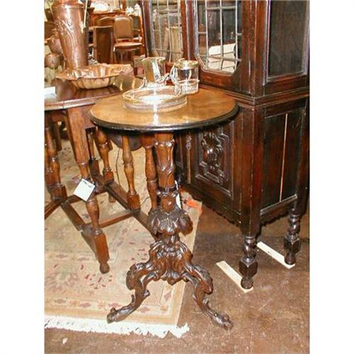 Black Forest Pipe Table with unique and beautifully carved tree motifs. Just the right size to tuck into any room as a side table or plant stand. Feet were modified before we acquired this item. Also one screw as made its way threw to the surface of the table. Old wood worm holes.