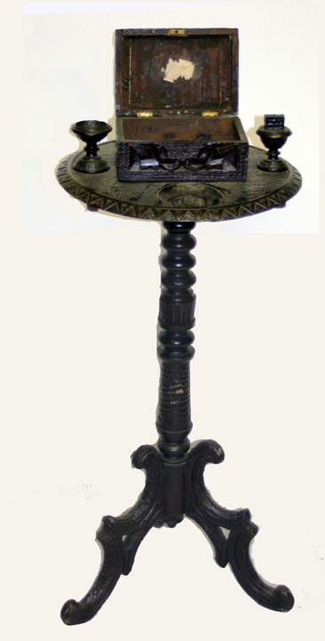 Black Forest Smoking Stand - Table top approx. 17" D and 33" H plus box and candlestick. Top to box is not a snug fit. Ash tray is missing. Seam in table has been reglued.