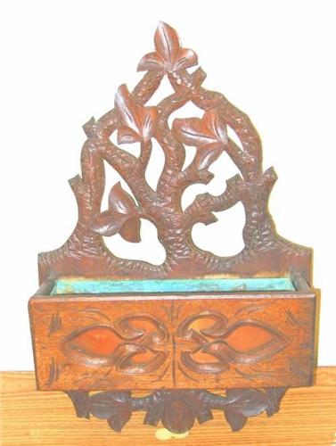 Antique Black Forest Walnut wall pocket plant holder. Hand carved, w/ orig copper insert. 18"tx11.5"wx3.5"d. 4lbs. (5-72)