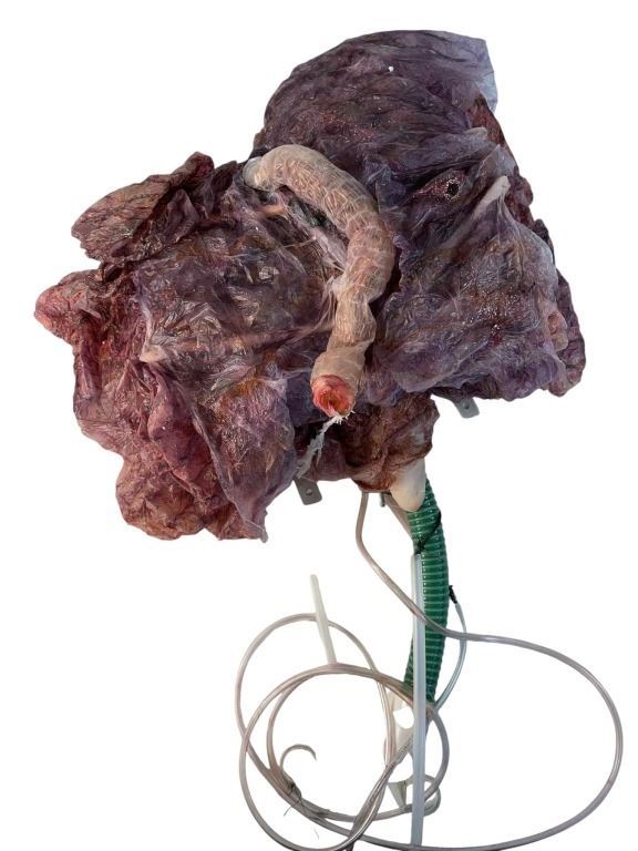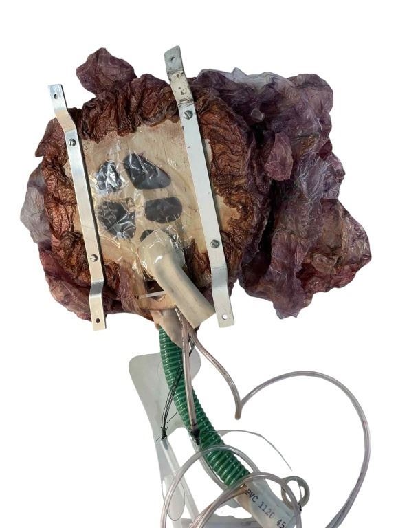 Made of a plastic type material that can be lit from the inside and can be made to appear breathing and pulsating. This hive is attached to a wall with a metal bracket system as can be seen in the photos along with rubber tubing for mucus to squirt out the opening of the front tube. Outside is not sticky.