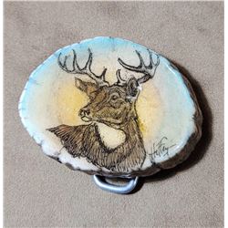 Very nice elk horn belt buckle. Scrimshaw scene of a whitetail deer.