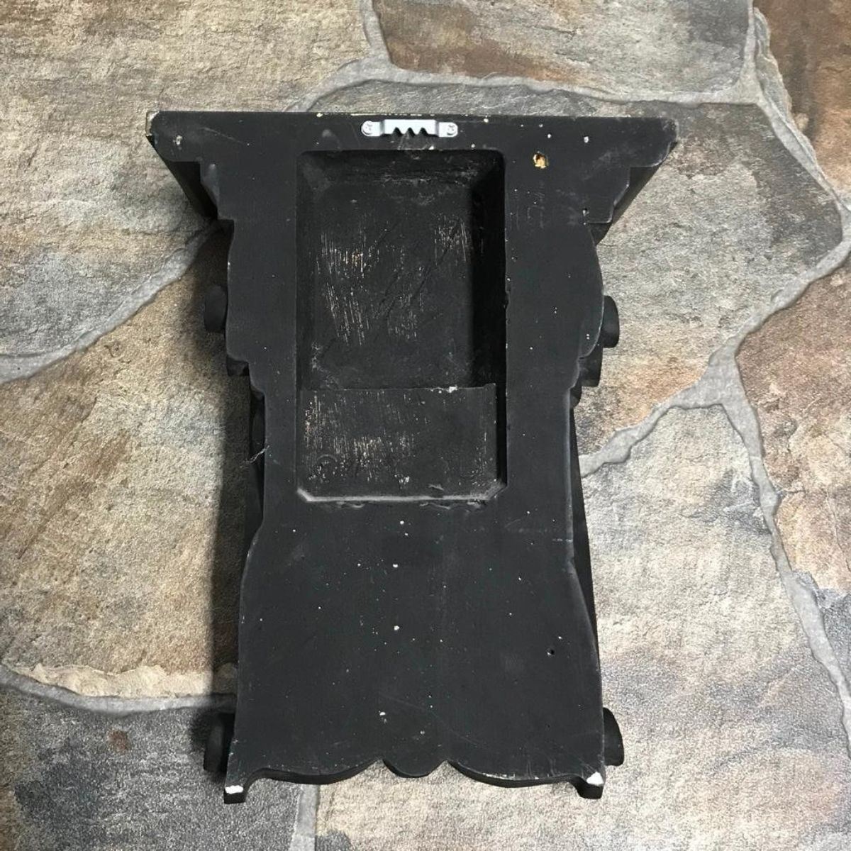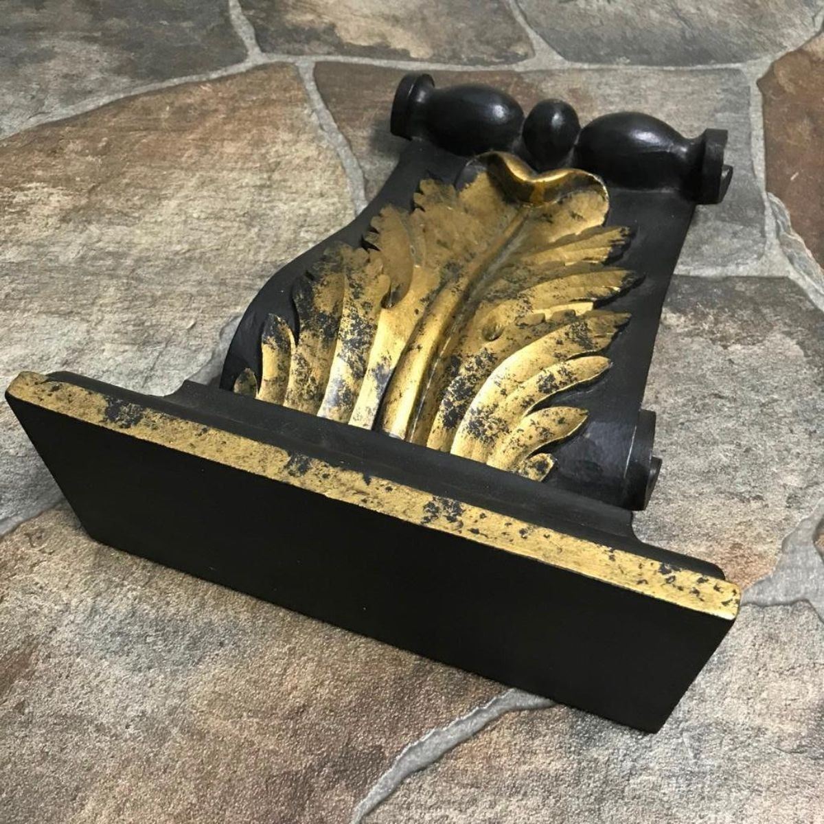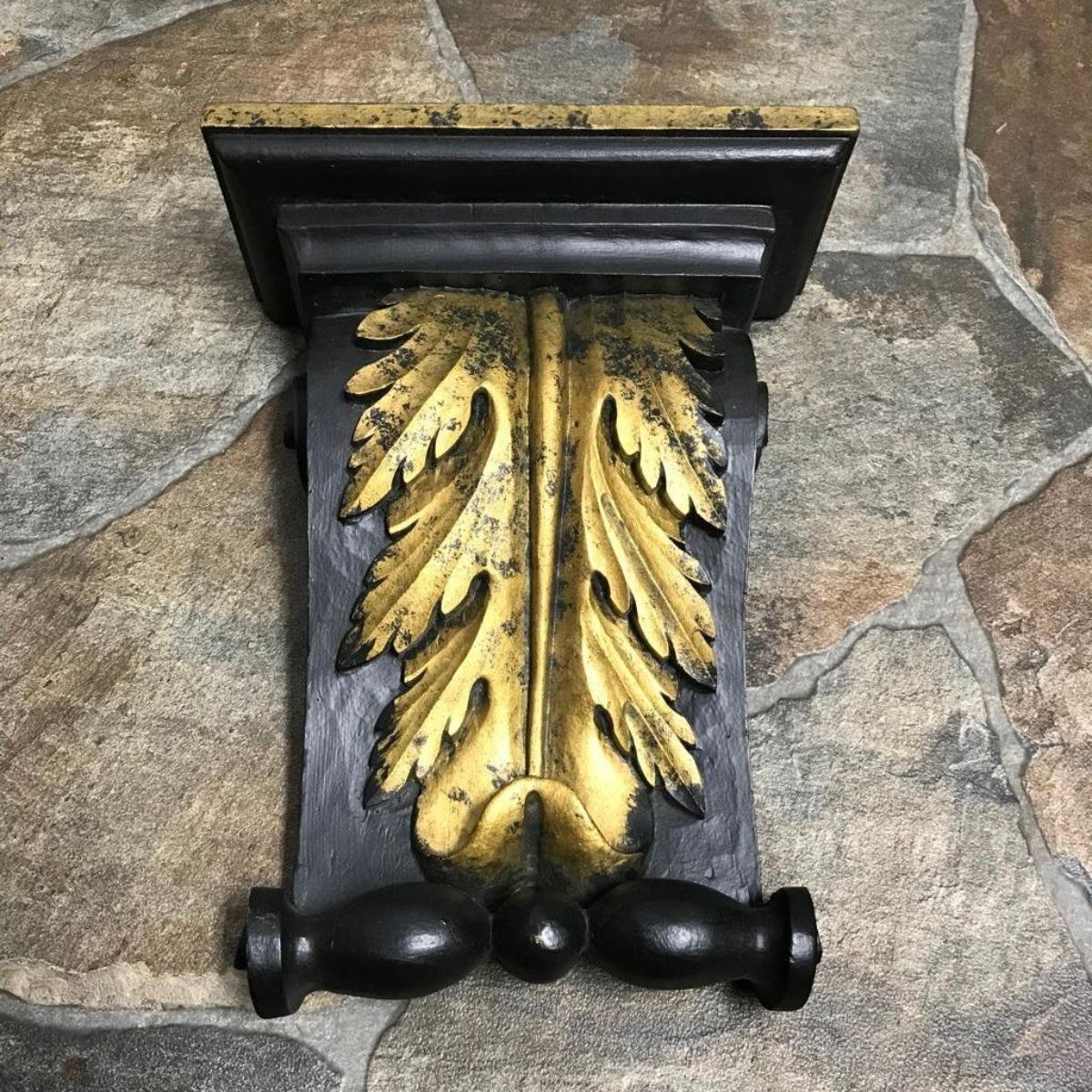 Black enamel with gilt highlights over lightweight composite wood, classical Acanthus leaf over scroll shelf wall display bracket.Â