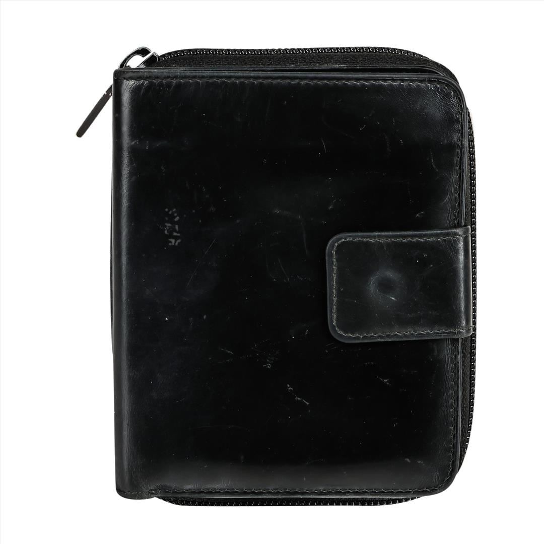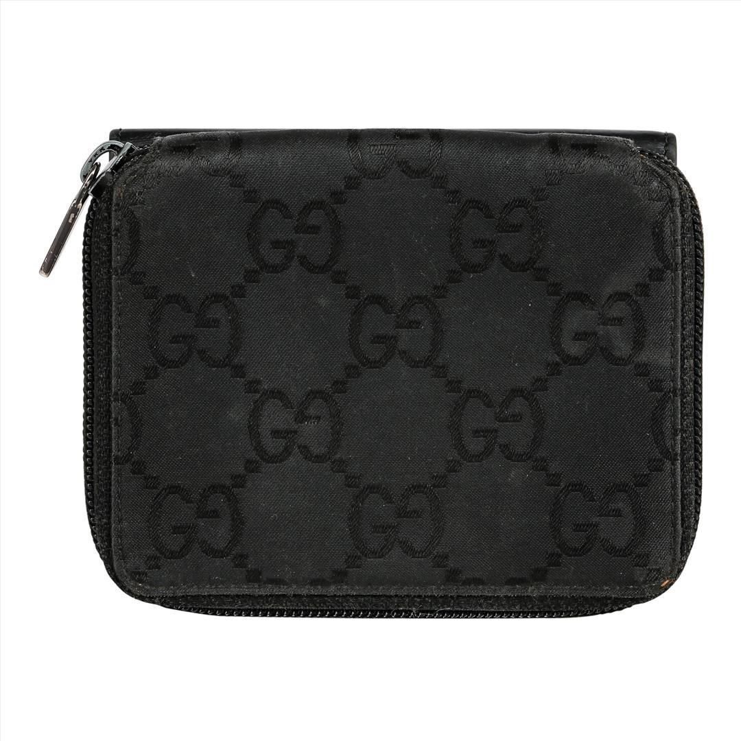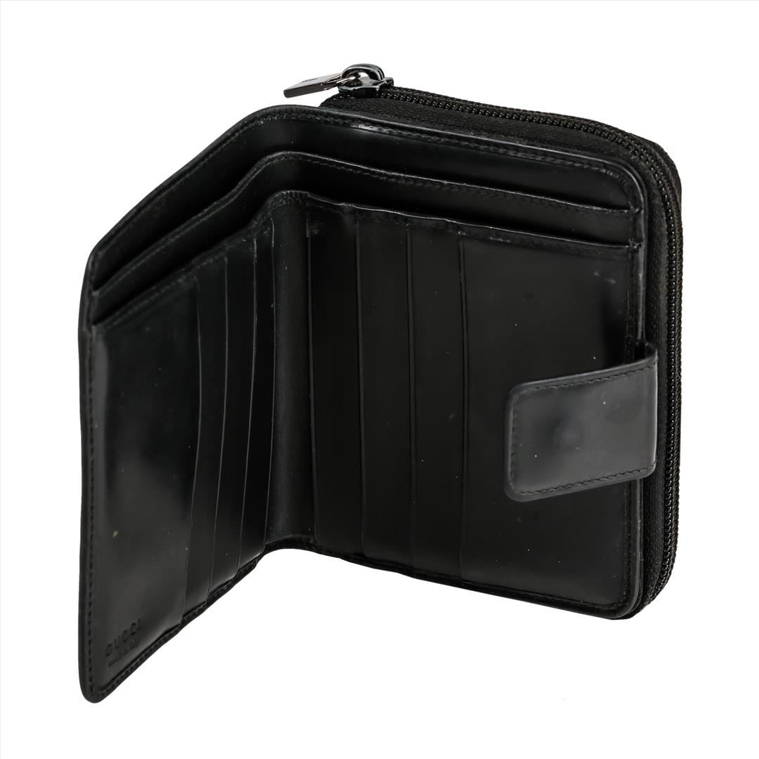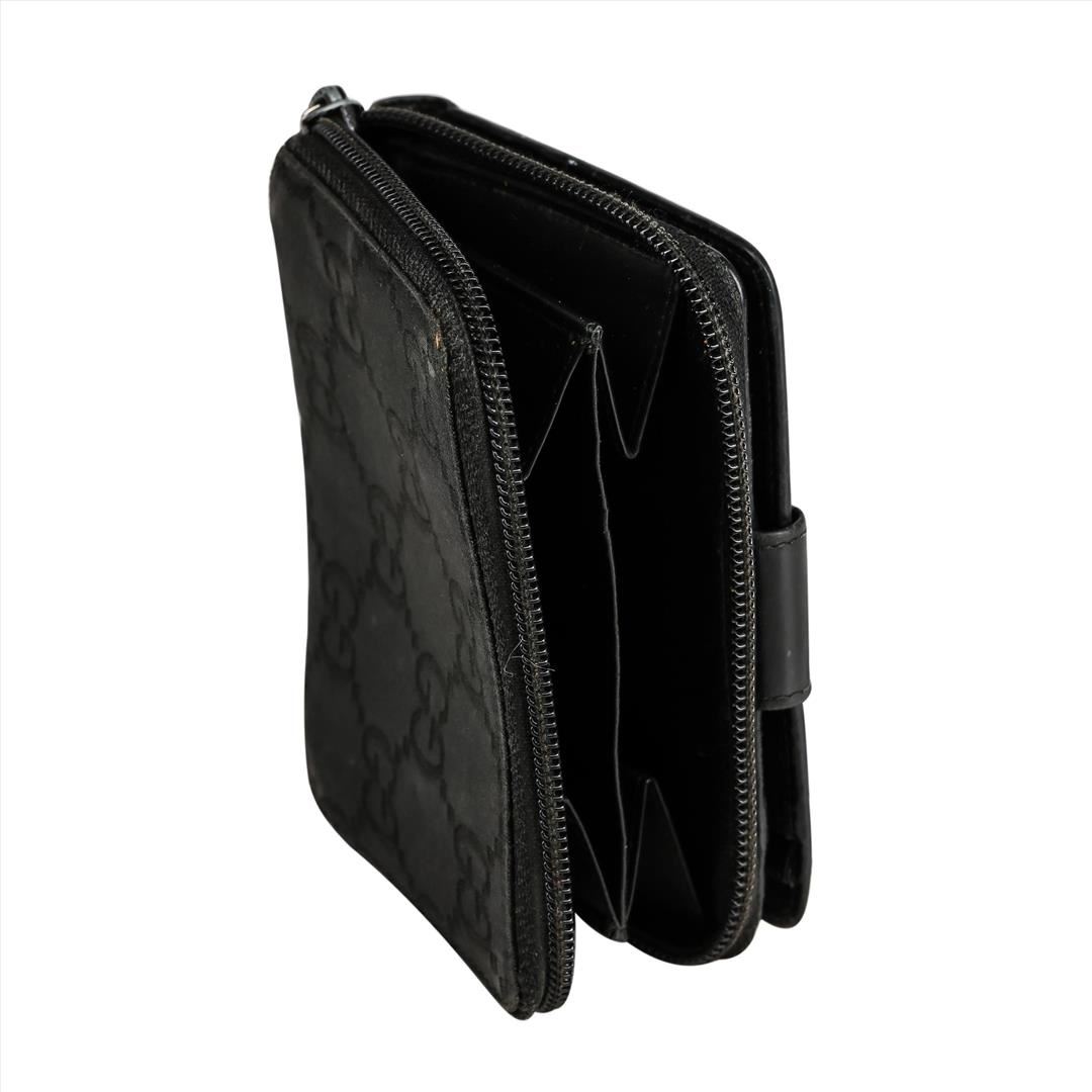 100% Authentic Gucci wallet featuring smooth black leather bi-fold wallet design with snap closure, 6 card slots, two bill compartments and a separate coin purse compartment made from signature Gucci G logo textile with zipper closure and dual compartment interior lined in leather. This item is in good used condition with some signs of wear throughout. Please see pictures. Complete with brown drawstring dustbag.