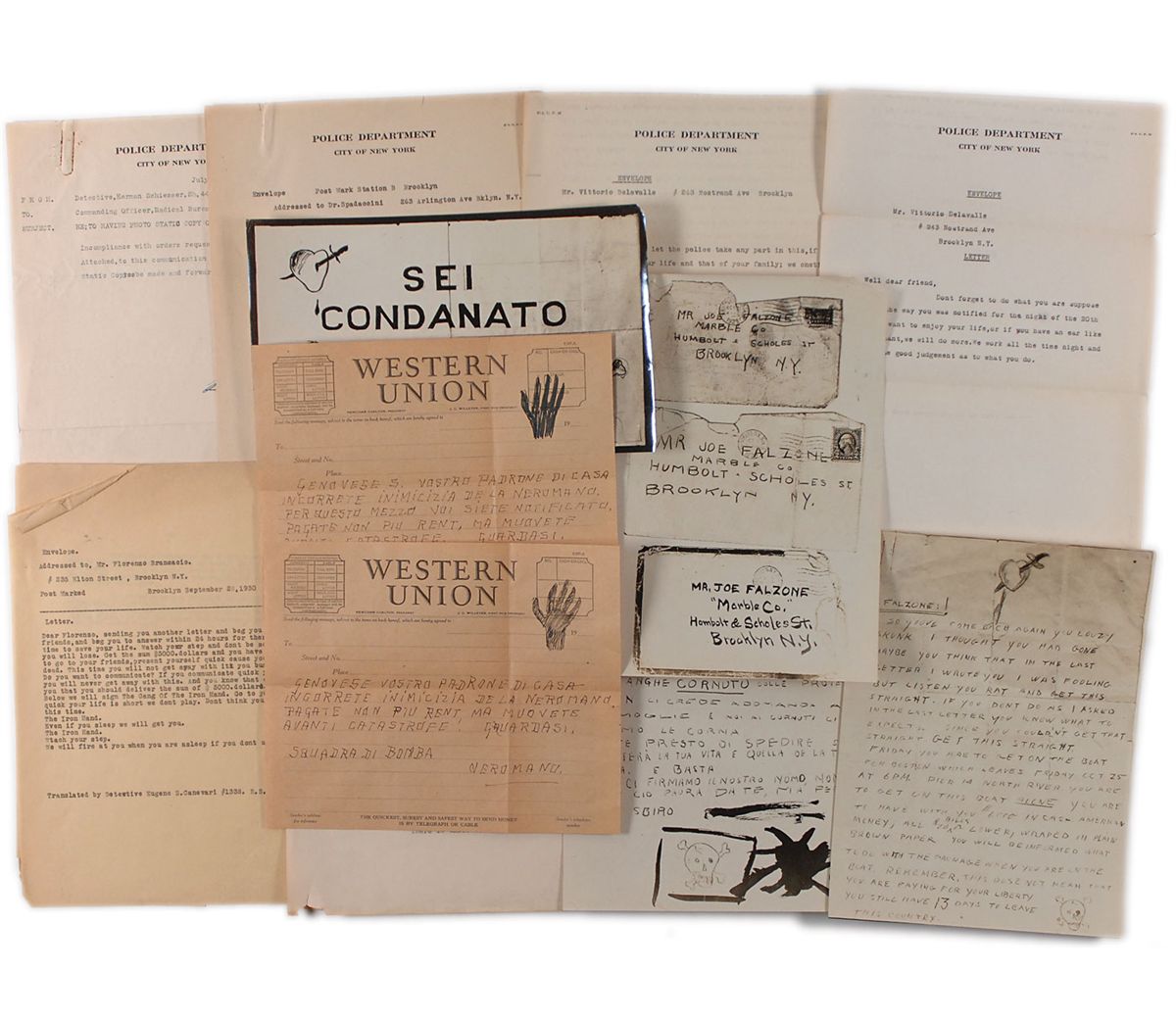 Black Hand was a method of extortion that involved sending a letter to the victim, usually threatening severe harm unless a certain amount of money was delivered to a specific place. Two similar handwritten letters in Italian, signed “Nero Mano [Black Hand],” each one page, 6.75 x 8.5, Western Union letterhead, no date but postmarked February 27 and 28, 1930. Both letters feature sketches of menacing black hands, and mention “Genovese.” Accompanied by both original mailing envelopes. Also includes five typed translations of other similar letters (most on NYPD letterhead), and four evidence photos of Black Hand letters. One translation, in part: “Dear damn fool and stupid is what you are, if you don’t do what you are supposed to do…we will show death with your own eyes…every day you will have a surprise when you least expect it.” In overall fine condition. An incredible window into the methods used by mobsters at the height of their power. Provenance: Eugene Canevari Collection.