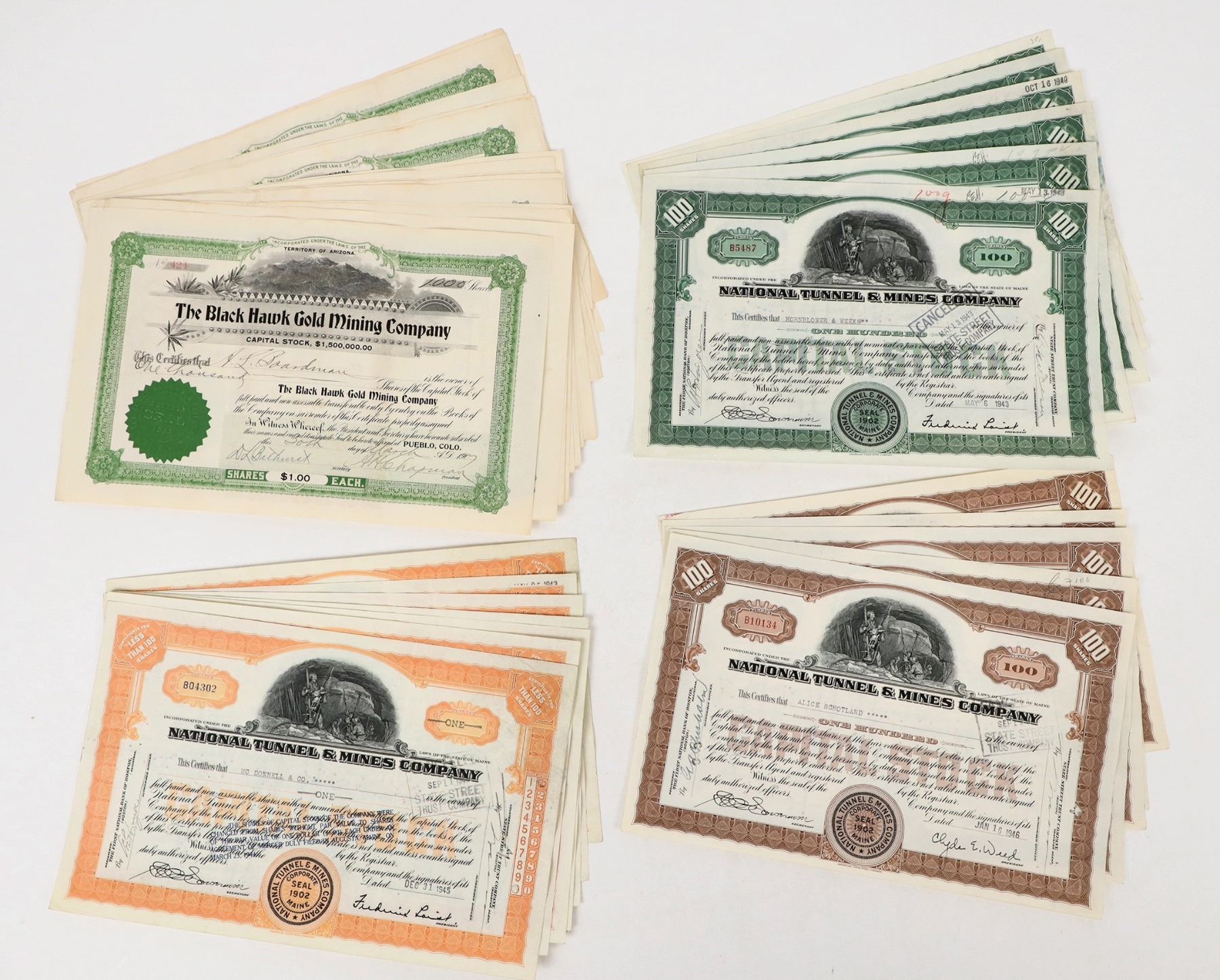 Two different Black Hawk area Colorado Mining Stocks. Black Hawk Gold Mining Company 1907 (17) and National Tunnel & Mines Company, 3 varieties: orange, brown and green, c.1940s (19). See photos.