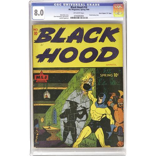 <B>Black Hood #10 Davis Crippen ("D" Copy) pedigree (MLJ, 1944) CGC VF 8.0 Off-white pages.</B></I> Here's the only CGC-certified copy of this issue and the first copy we've ever offered. This issue has the last appearance of the Hangman in this series, a solo outing for Dusty (the Shield's sidekick), and of course the exploits of the Black Hood himself. Overstreet 2006 VF 8.0 value = $388. CGC census 6/06: 1 in 8.0, none higher. <BR><BR><B>Important notice:</B> Heritage usually auctions material at the rate of 200-250 lots per hour. On some occasions eBay Live bid software or the Internet may not be able to keep up with the pace of the auction. We recommend placing a realistic absentee bid now as insurance to avoid disappointment. Occasionally the auctioneer may eliminate or reject an eBay Live bid, and the auctioneer may also reopen a lot after the close of the eBay live bidding (usually because we missed an audience bid), and may reject your bid even if it shows you as the winning bidder. By bidding via eBay Live, you agree that Heritage may award the lot to another bidder at its sole discretion under the circumstances described above or any other reasonable circumstances. Since eBay bids are not shown to us until we open the lot on the floor, we treat those bids just like floor bids. In most cases the floor responds before the eBay bid is presented to us, due to Internet lag time, so for consistency we have made it a policy that floor bids are always considered first over tie eBay live bids. Also please note that all Heritage lots purchased through eBay Live carry a 22.5% Buyer's Premium. Please make sure you read the Terms and Conditions before you bid. This lot is being auctioned in conjunction with a live floor auction by Heritage Auction Galleries. All final auction and invoice information will be supplied by Heritage Auction Galleries, and all other information should be considered preliminary. Lot:41001 <BR><BR><B>Winning Notification and Billing:</B> After the FINAL session in this auction is complete, Heritage will send e-mail and snail mail invoices. This process normally takes several days. All final auction and invoice information will be supplied by Heritage Auction Galleries, and all other information should be considered preliminary. <BR><BR>This auction will be conducted on a live auction floor and over the Internet through eBay Live. If you choose to place an absentee bid, please take a moment to <font color='#0000ff'><u><a href='http://pages.ebay.com/liveauctions/help/before/laabsentee.html'>learn how eBay Live absentee bidding works</a></u></font><font color='#000000'>