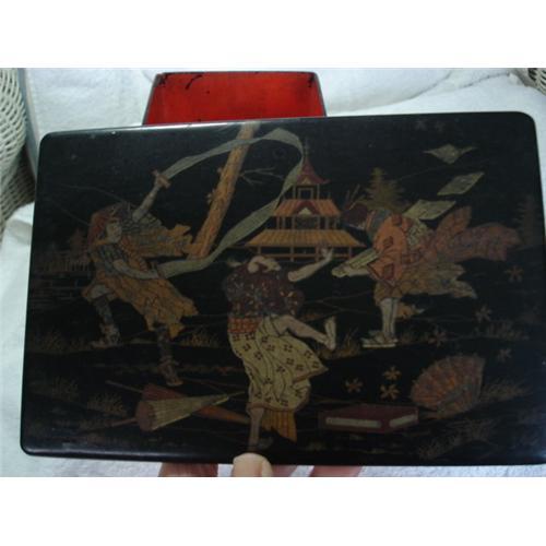 This beautiful very old lacquered box made in Japan has a elaborate scene of three men blowing in the wind, one has manuscripts blowing away, second is swept off has feet, third is hanging onto a long ribbon of fabric. Baskets clothing,umbrellas, grass & box are being tossed about by the wind. The box has more gold decoration than most black lacquered boxes. The price is low because there is a small hardly noticeable scratch on front of box.Some Wear on box especially bottom inside & outide. A small chip inside in one corner that could easily be repaired, see photo.