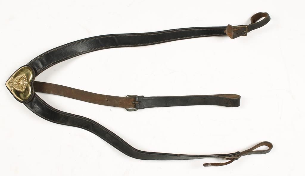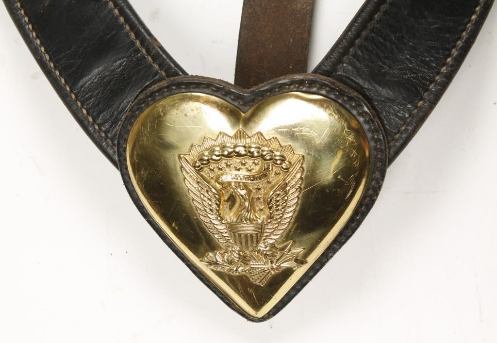 With heart shaped emblem featuring the "Great Seal" eagle. Leather stamped "R.D.Y.". Aged showing mottling and scratching to emblem, leather shows wear, with oxidation to buckles.
