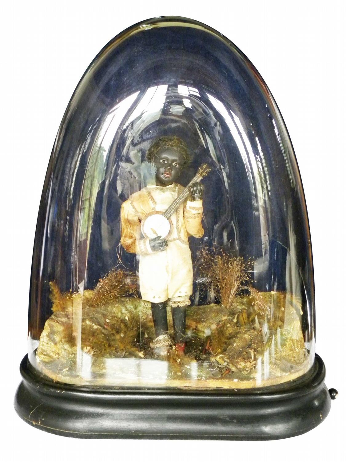 Black Man Playing Banjo Automaton. Broken glass dome, otherwise very good condition. 12 1/2 X 16 X 6 1/2 inches.