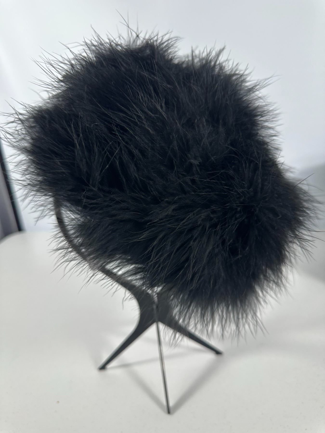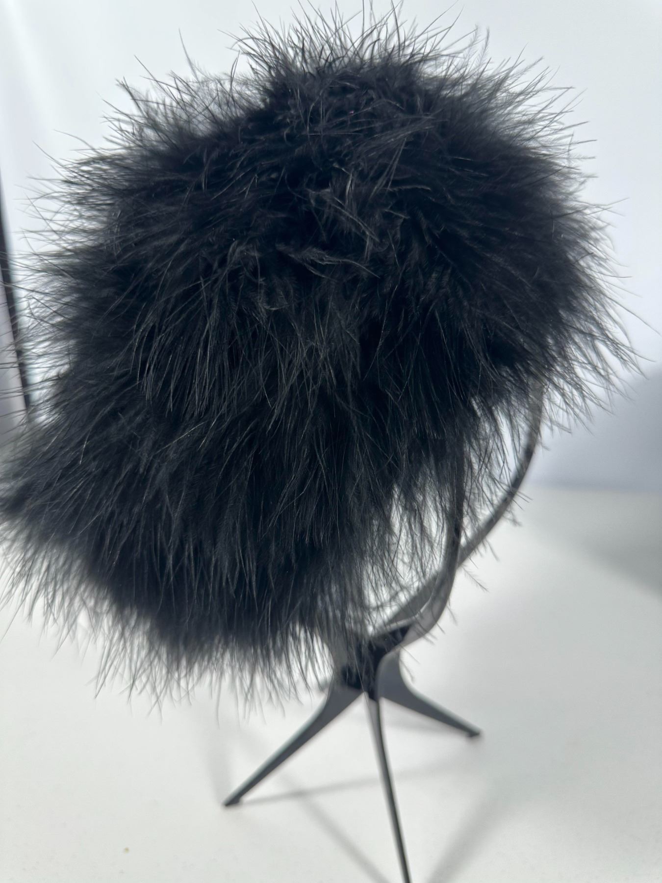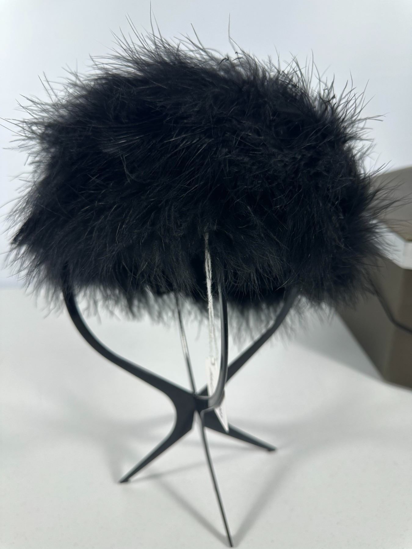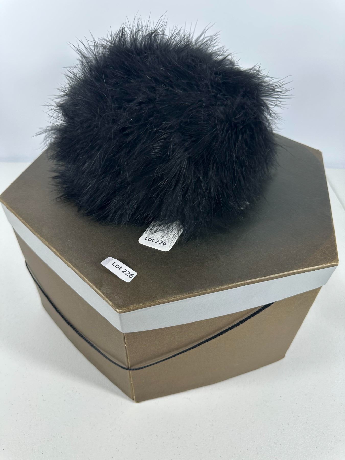 Plush black marabou feather cap; accompanied by a bronze‑tone hexagonal hat box (not original).
