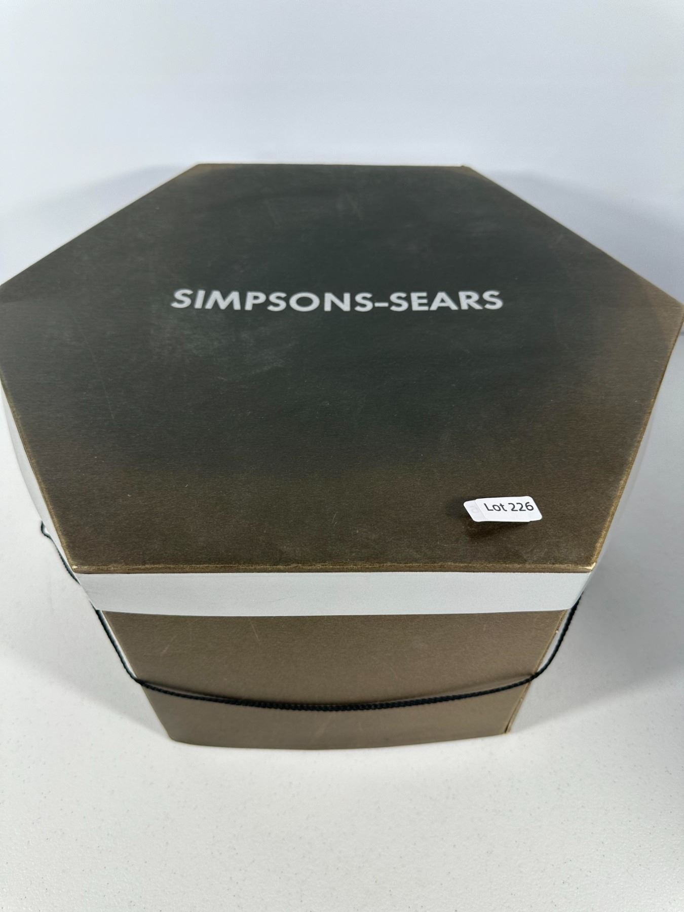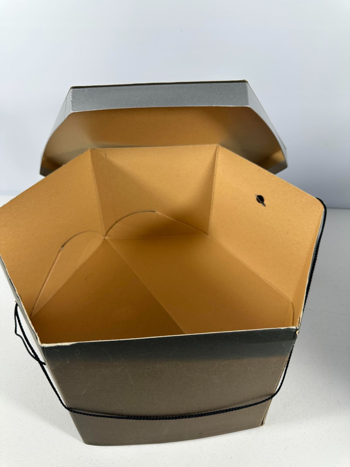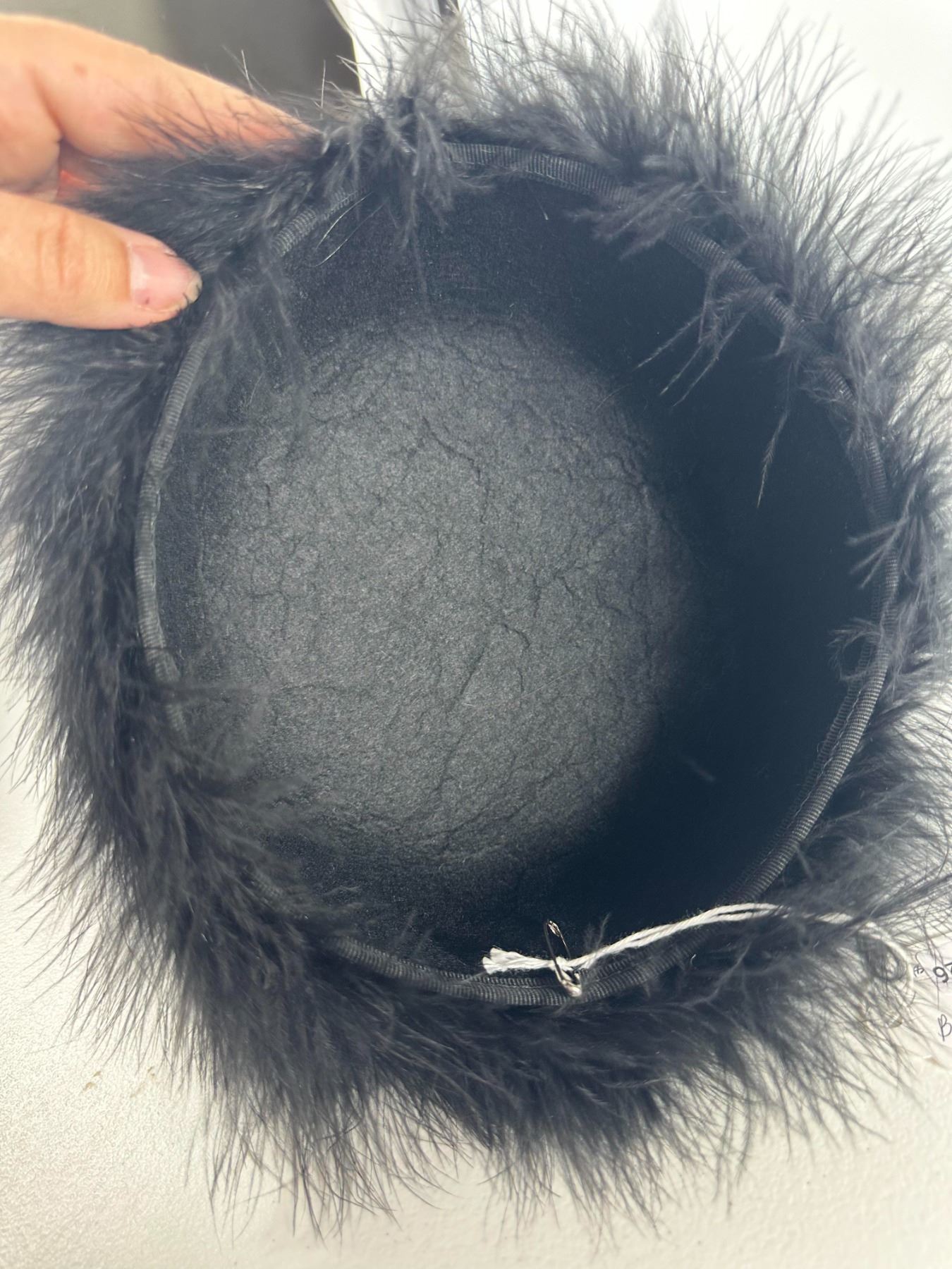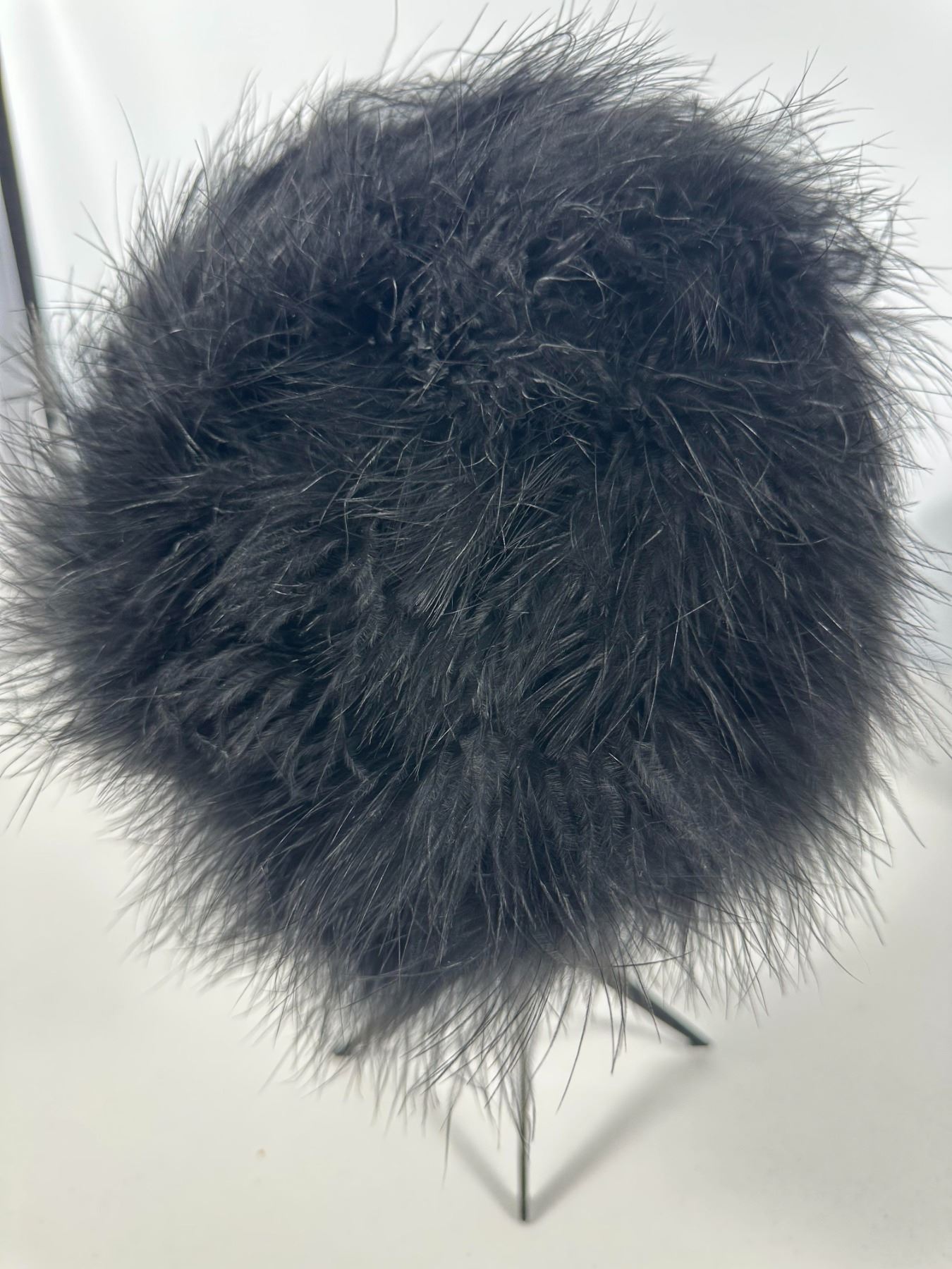 Plush black marabou feather cap; accompanied by a bronze‑tone hexagonal hat box (not original).