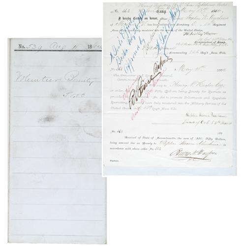 <Our item number 140932><B>Black Massachusetts 54th Enlistment Document.</B> Partly-printed document, being an Enlistment and Bounty Agent Payment Certificate detailing Stephen Warren Morehouse joining Company E, of the 54th Massachusetts Regiment, at "Head Quarters U.S. Forces Lighthouse Inlet," at Folly Island, South Carolina, 2pp, 7¾ x 9¾ in., 28 May 1864. Accompanied by a docket page, dated 11 Aug.1864, serving as proof for receiving his payment of the $50.00 Enlistment Bounty. There are confirmation signatures across the front written in blue, red and brown ink, approving the document. Morehouse was paid the sum of fifty dollars at the time of his enlistment. The upper portion of the document states: "No. 363. Fort Green May 28th, 1864. I hereby Certify on honor, That Private Stephen W. Morehouse of Mealone N.Y. has been enlisted into Company E, 54th Regiment Mass. Vols., and duly mustered into the service of the United States." Signed by Colonel E.N. Hallowell and Lieut enant Colonel H. Worthy Hooper of the 54th Regiment, Massachusetts. <BR><BR>Edward N. Hallowell took over as the Colonel of the 54th regiment after the death of Col. Robert Gould Shaw--who died in July 1863 during the ill-fated attack on Fort Wagner in South Carolina. Hallowell, in contrast to the fallen Shaw, treated his soldiers badly. Black regiments were always headed by white officers. We assume that Morehouse was white, because he was paid $50, when men were generally paid $25, black or white. This was also before Congress passed the equal pay law for African American soldiers later that year. <BR>Estimated Value $1,500 - 2,000. <BR><BR>Our item number 140932<BR><IMAGES><P ALIGN="CENTER"><IMG SRC="http://www.goldbergcoins.net/liveauction/49jpegs/140932.jpg"> </P></IMAGES>