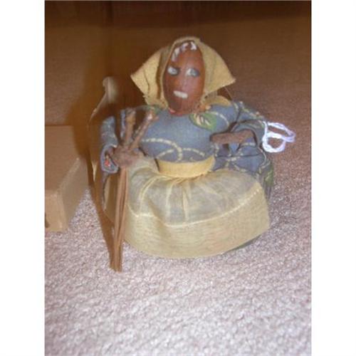 Here's an unusual item. It is a black nut doll. The head is a nut and the arms are pipecleaners. She has on a cotton print dress and organdy apron. I'm assuming she is to represent a black woman. She has a scarf on her head and is holding pine needles. This item is in it's original box and it has the original paper stuffing under the skrit. The doll doesn't have legs. There is cotton for the stuffing. I guess it could of cover a small container of some kind. If you can use it, please bid. This item is from a smoke free environment.
