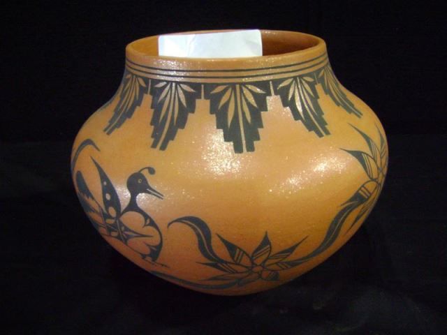 Black-On-Red Micaceous Santo Domingo Pot, Floral Pattern on Side by Mark Wayne Garcia 8"x9 1/2"x5 1/