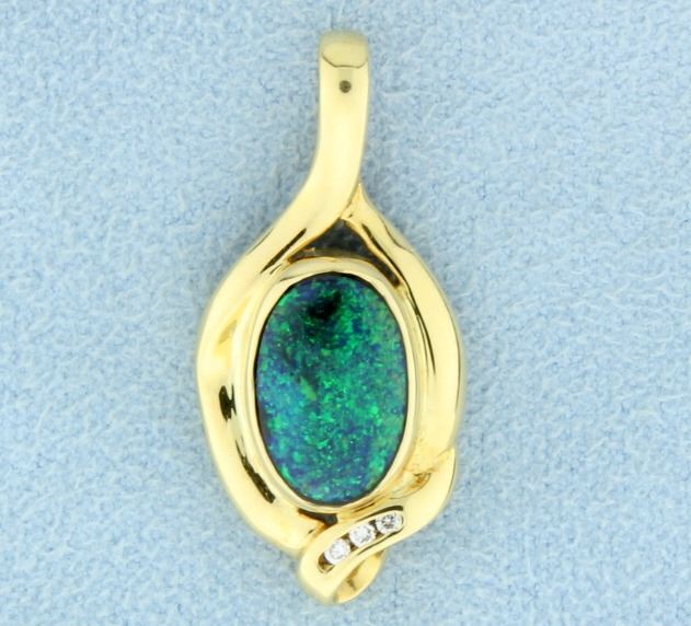 In 18K yellow gold, the pendant contains a 11x8mm oval black opal gemstone with excellent color of play! Also it contains three high quality .01ct diamonds. The pendant is just over an inch long. 3.4g