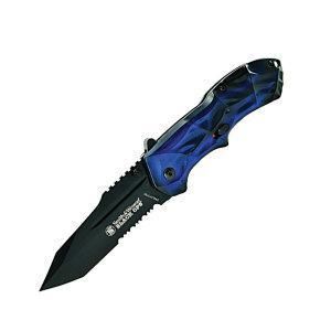 Long Description Asssited knife with 3.4 in. 4034 stainless steel with blue/black 4.3 in. handle. Thumb knob, finger actuator, liner and safety locks. Features Blade Length: 3.35 in. Overall Length: 7.65 in. Blade Material: 4034 steel Handle Material: aluminum