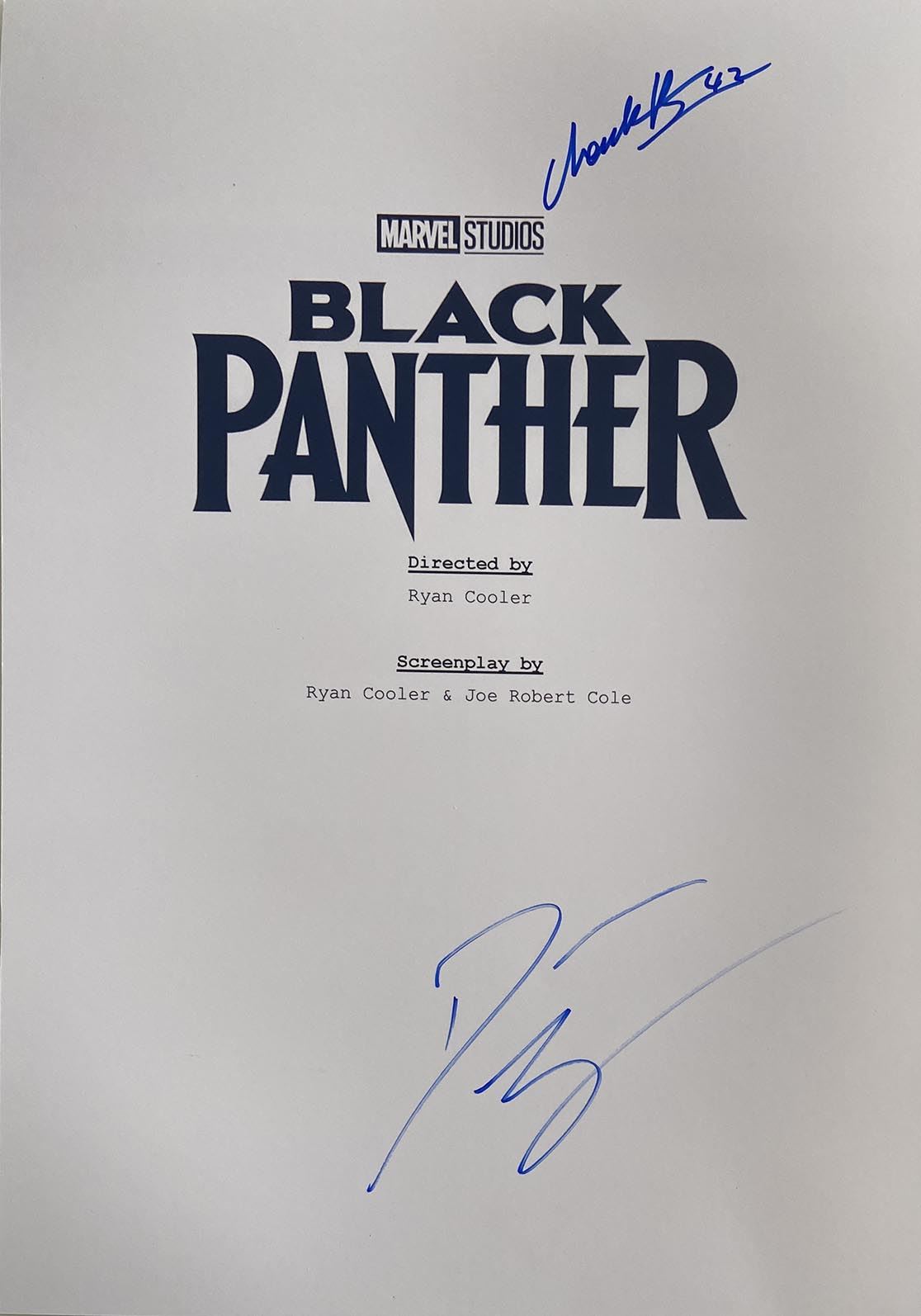 Black Panther cast signed script cover photo autographed by Chadwick Boseman and Danai Gurira. 8x12 inches