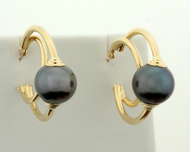 In 14k yellow gold. Each earring contains a 9mm natural black pearl with high luster. 1" long with hatch openings. 3.1g.