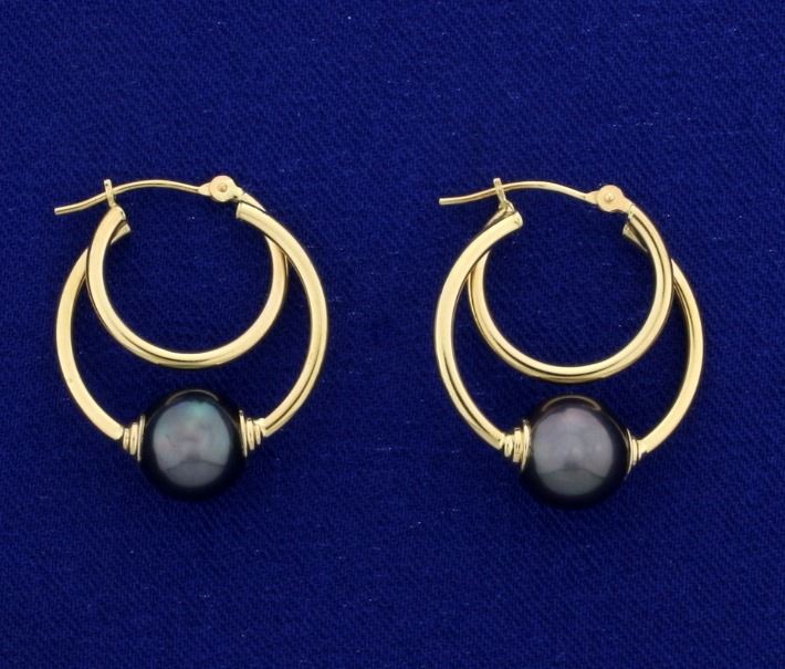 In 14k yellow gold. Each earring contains a 9mm natural black pearl with high luster. 1" long with hatch openings. 3.1g.
