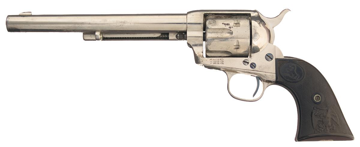 Manufactured in 1884. The top of the barrel is marked with the one line address, the three line, three patent dates appear on the lower left side of the frame and the upper left front of the trigger guard bow is marked "45CAL". The barrel under the ejector housing is stamped "O / G / C" and the matching serial number is marked on the frame, trigger guard and backstrap. The loading gate is marked with assembly number "7307". All nickel finish with a niter blue trigger and fitted with two piece checkered American Eagle, Rampant Colt grips. Complete with a leather Heiser double loop holster and basket weave belt.