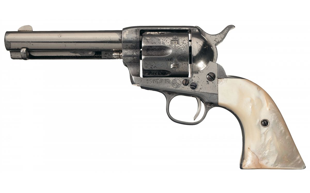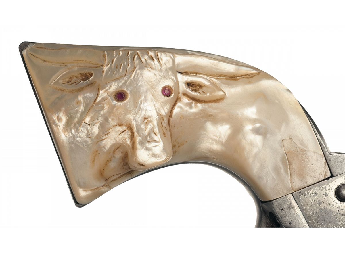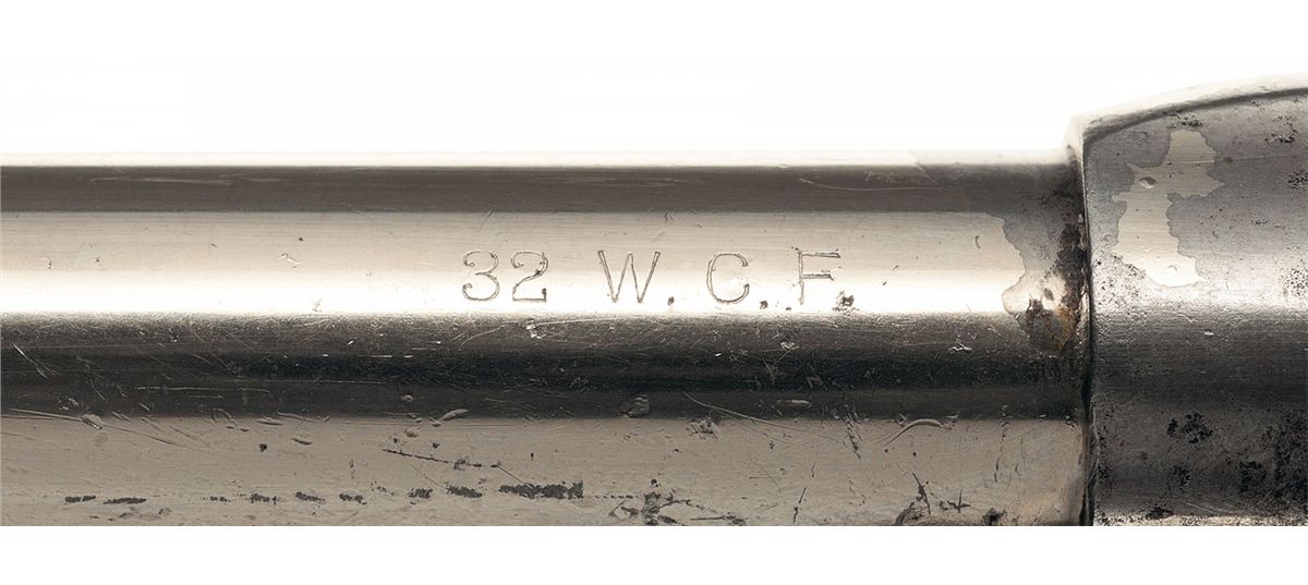 Manufactured in 1891. The top of the barrel is marked "COLT'S PT.F.A.MFG.Co. HARTFORD CT.U.S.A.". and "32 W.C.F." on the left side. The left side of the frame is marked with the two-line, three date patent markings followed by the circled Rampant Colt. The matching serial number is marked on the bottom of the frame, trigger guard and back strap. All nickel finish and fitted with pearl grips with a carved steer head with red eyes on the right side