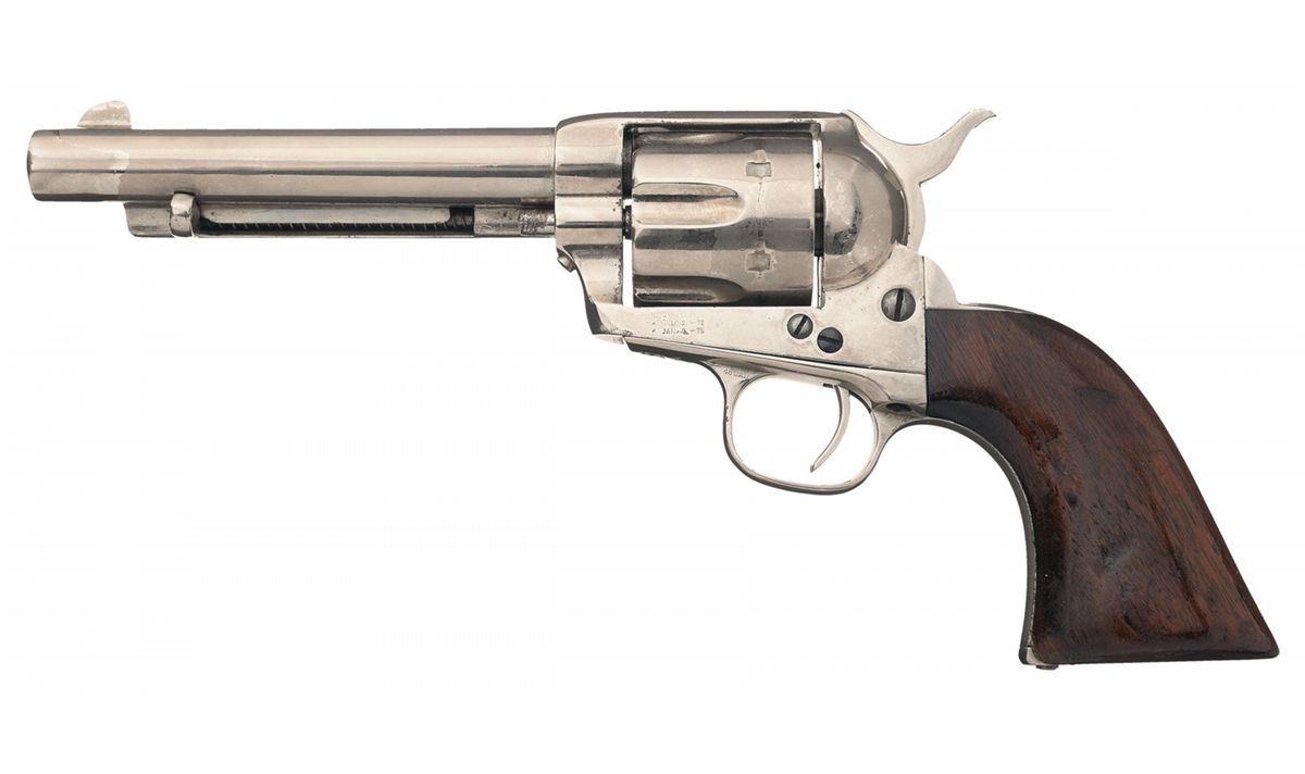Condition: Good as non-professionally, possibly period nickel re-plated, 90% of the nickel finish remains with flaking on the muzzle, front sight, ejector rod housing and both sides of the frame. There are some tool marks on the cylinder pin, bottom of barrel and ejector rod housing. The refinished walnut grip is fair with an "x" scratched on each side of the butt and some scattered scratches and dings. Mechanically functions, but is missing full cock cylinder notch.