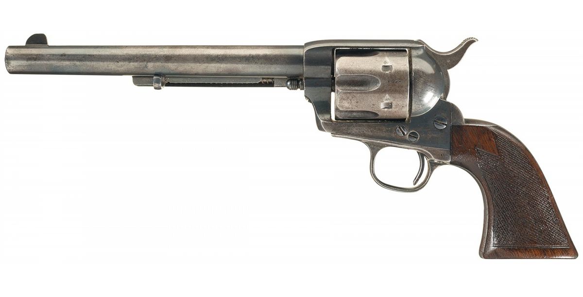 Manufactured in 1884. The top of the barrel is marked with the one line address, the bottom of the barrel is marked "44" just ahead of the cylinder pin, the left side of the frame is marked with the three line, three patent date marking and the front, left side of the trigger guard bow is marked "44 C.F.". Visible numbers are matching. Fitted with a one piece grip that has been checkered. The letter "W" is stamped on the bottom of the grip and on the front grip strap.