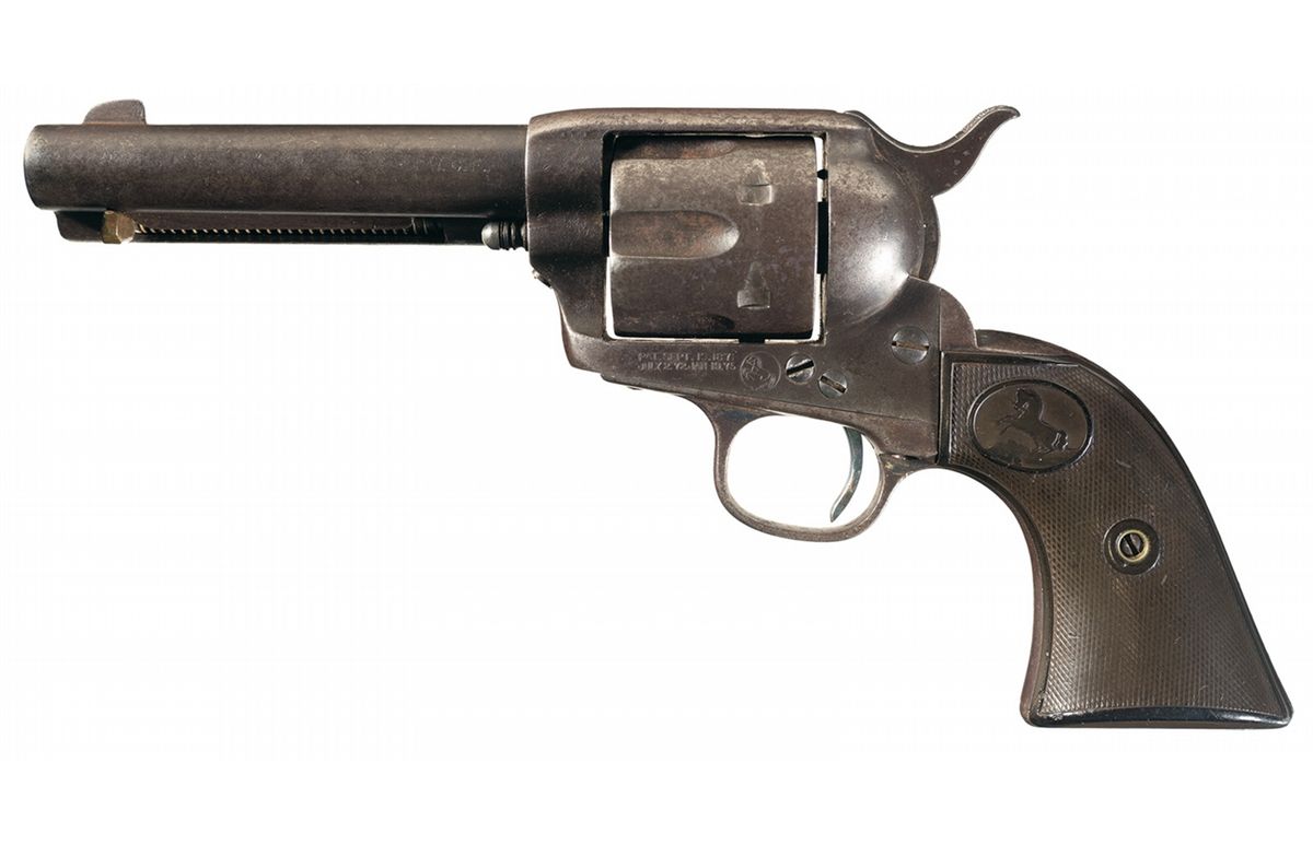 Manufactured in 1893. The top of the barrel is marked with the two-line address, the left side of the frame is marked with the two-line, three-patent dates followed by the circled Rampant Colt. The matching serial number is marked on the frame, trigger guard and back strap and the loading gate has the assembly number "237". Blade front and frame notch rear sights, crude brass replacement ejector rod head and fitted with checkered hard rubber grips with the Rampant Colt in an oval at the top.