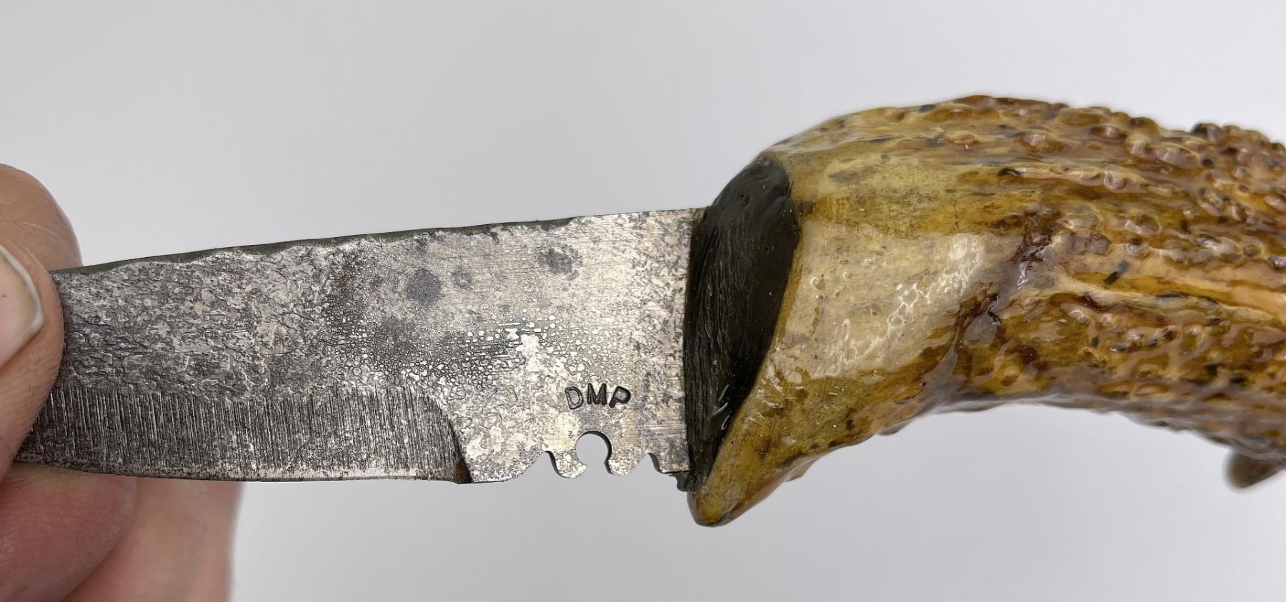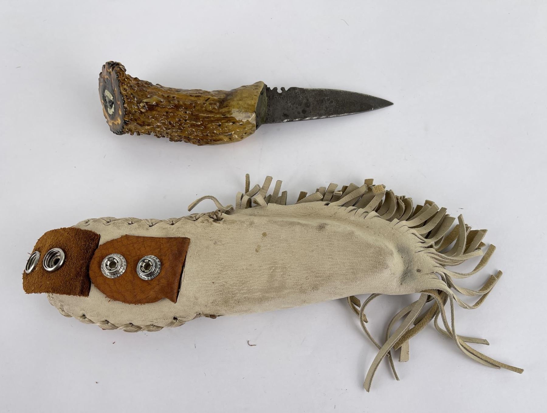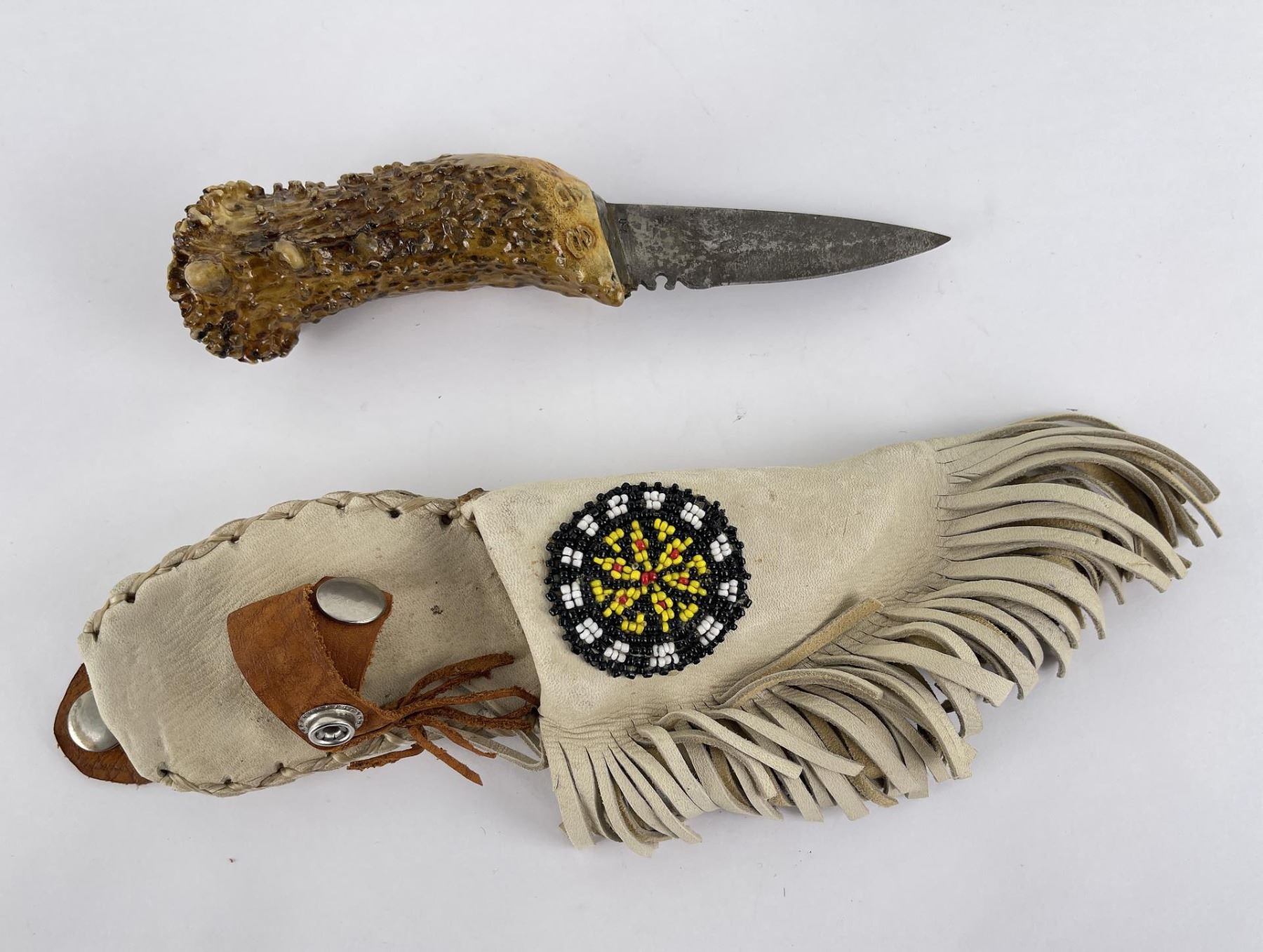 Beaded leather sheath with fringe. Horn handle. Cap is inset with turquoise. 7.5" long.