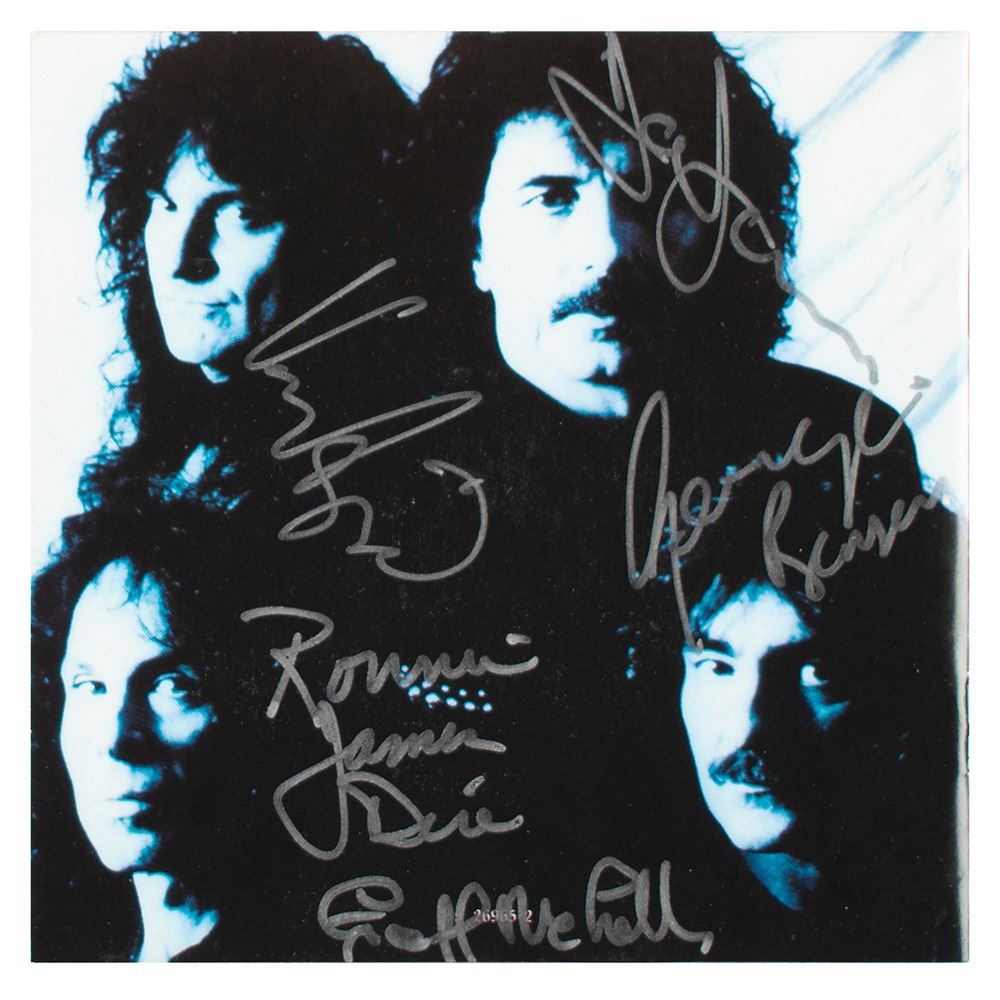Dehumanizer CD by Black Sabbath, signed on the back of the CD booklet in silver ink by Ronnie James Dio, Tony Iommi, Geezer Butler, Vinny Appice, and Geoff Nicholls. In fine condition. The record is included. Accompanied by an unused backstage pass for a Black Sabbath concert.