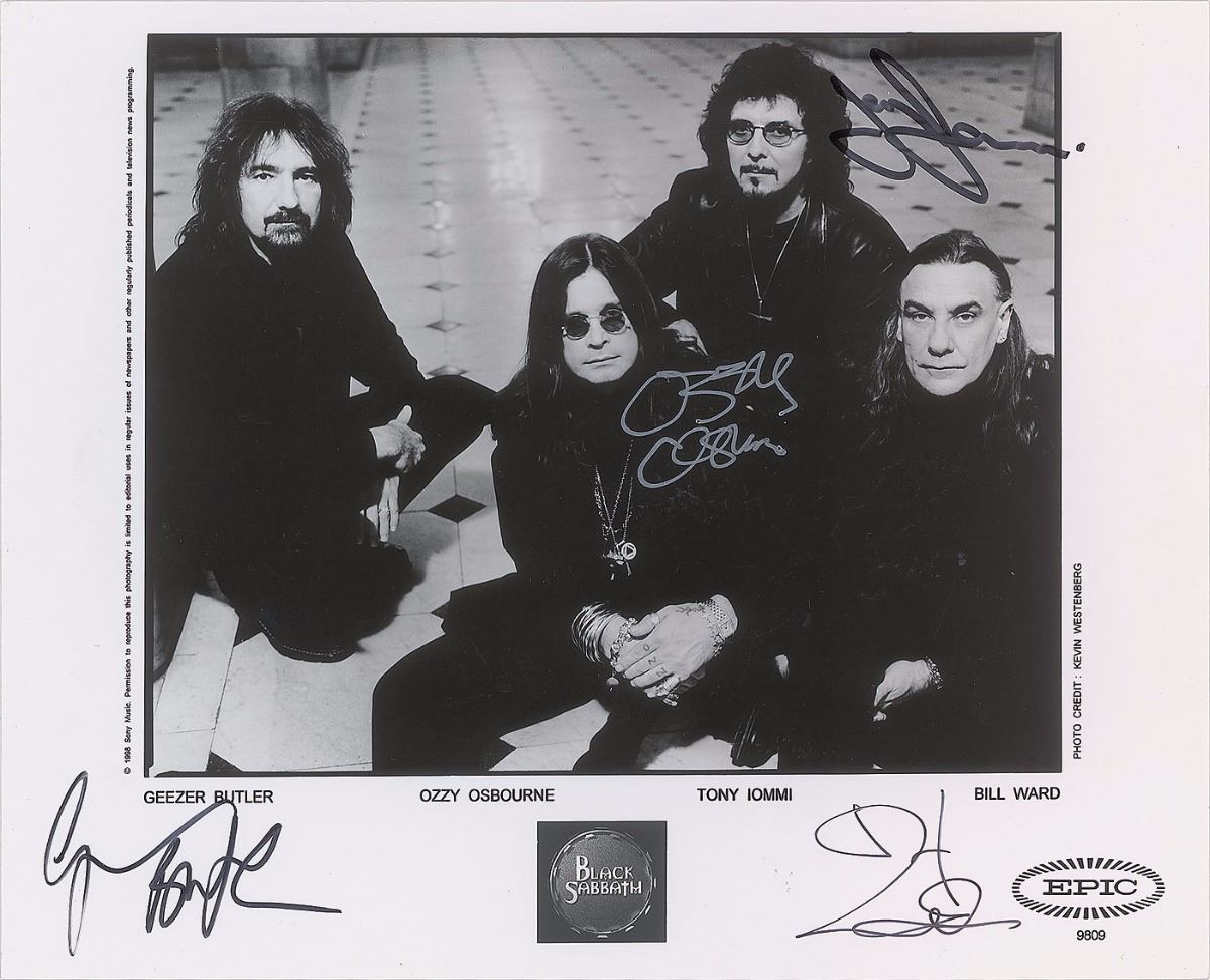 Satin-finish 10 x 8 Epic Records publicity photo of Black Sabbath, signed in silver ink by Ozzy Osbourne, and in black felt tip by Geezer Butler, Tony Iommi, and Bill Ward. In fine condition. Accompanied by a copy of a flyer for a CD signing at the Bloomingdale Tower Records on October 24, 1998. An appealing assemblage of the legendary metal band’s four original members.