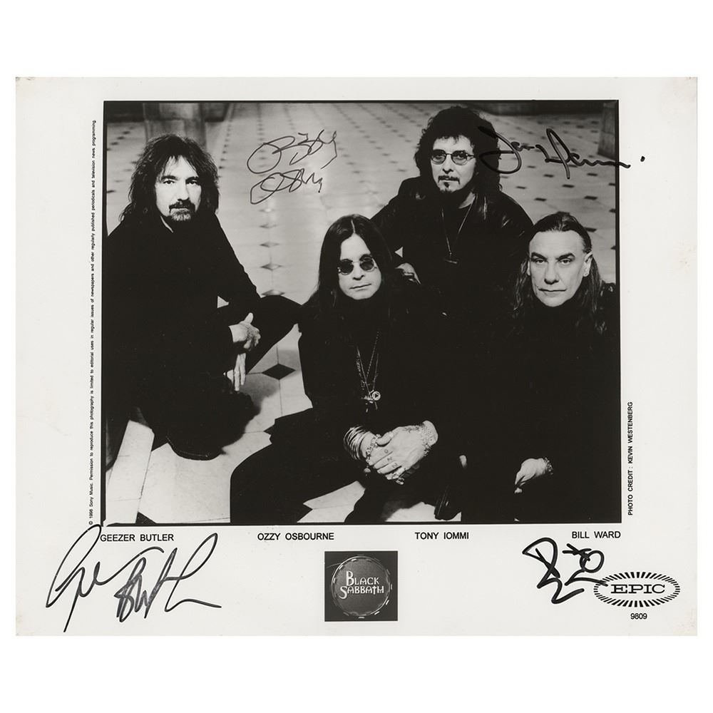 Satin-finish 10 x 8 Epic promo photo of Black Sabbath, signed in black felt tip by Ozzy Osbourne, Geezer Butler, Tony Iommi, and Bill Ward. In very good to fine condition, with some small surface creases, and a light bend to the lower left.