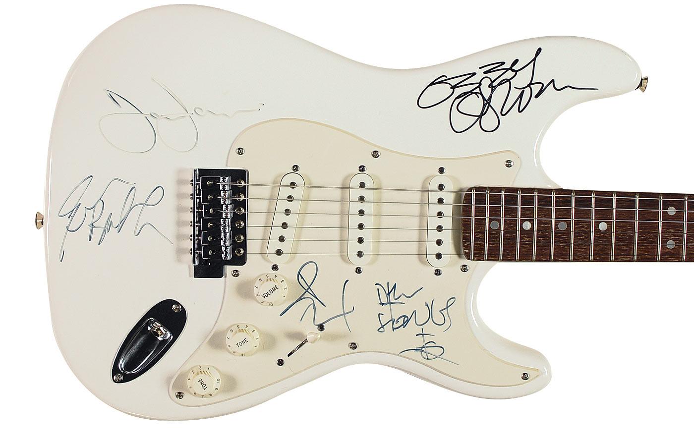 Cream-colored Team ‘stratocaster-style’ electric guitar, signed on the body in black felt tip by Ozzy Osbourne, Tony Iommi, and Geezer Butler, and signed on the off-white pickguard by Bill Ward. In fine condition. Oversized.