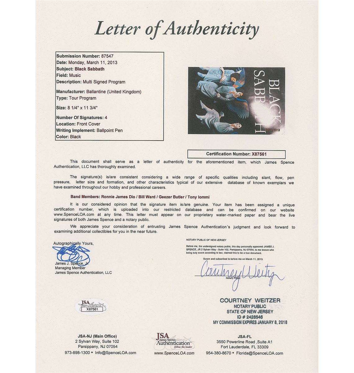 Program from the band’s 1980 Heaven and Hell tour of the United Kingdom, 8.25 x 11.75, signed on the front cover in black ballpoint by Tony Iommi, Geezer Butler, Bill Ward, and Ronnie James Dio. In fine condition. Accompanied by a full letter of authenticity from James Spence.