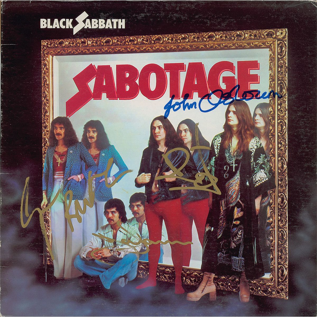 Sabotage album signed on the front cover in gold ink by Tony Iommi, Geezer Butler, and Bill Ward, and in blue felt tip by Ozzy Osbourne using his given name, “John Osbourne.” In fine condition, with general edge wear, dings and creases. The record is not included. The consignor notes that he obtained these signatures in person in Detroit, and that Osbourne’s assistant brought the album to him while he was on the tour bus paying bills; he signed this with his uncommon full name because he was still in ‘check-signing mode.’