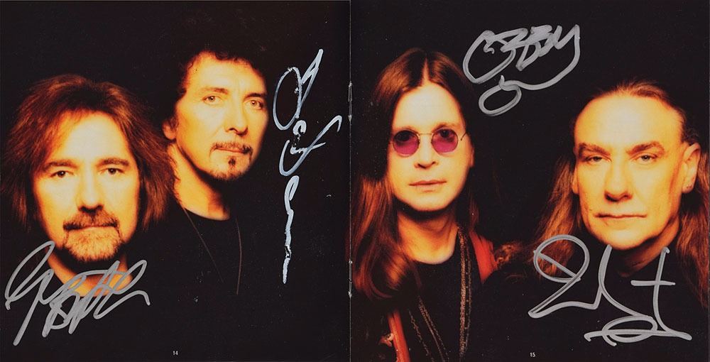 Reunion CD booklet signed on the booklet centerfold in silver ink by Ozzy Osbourne, Geezer Butler, Tony Iommi, and Bill Ward. In fine condition. The CD is not included.