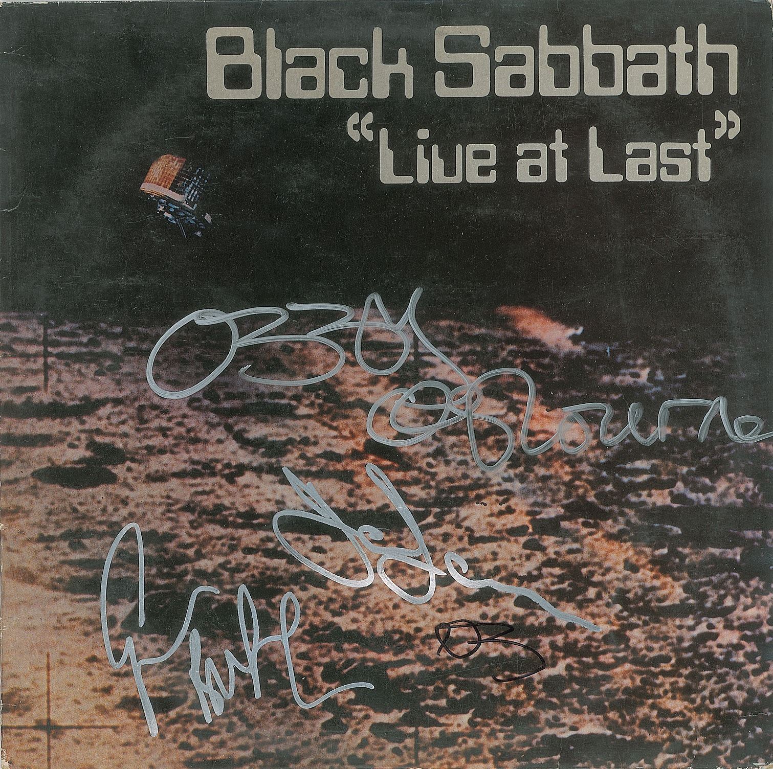 'Live at Last' album by Black Sabbath, signed on the front cover in silver ink by Ozzy Osbourne, Geezer Butler, and Tony Iommi. In very good to fine condition, with overall warping. The record is not included.