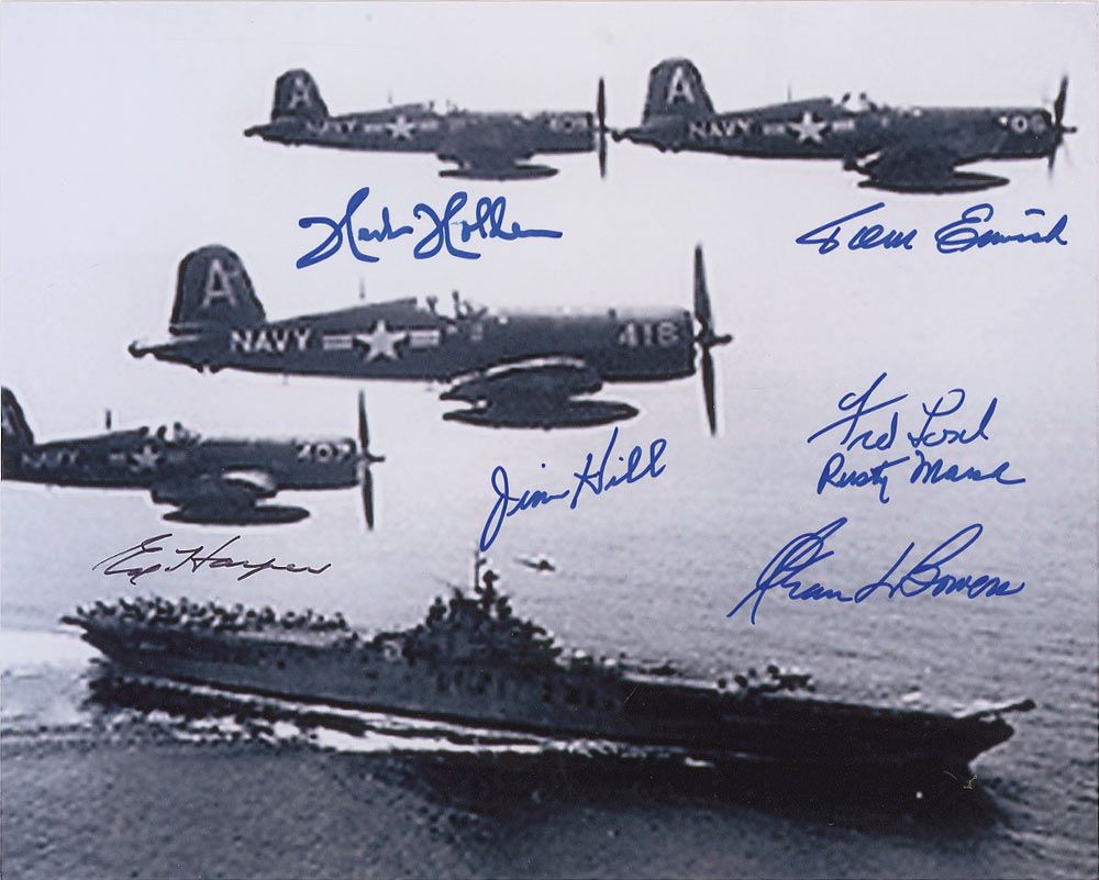 Satin-finish 10 x 8 photo of the squadron in formation, signed in blue and black felt tip by seven pilots. Signers are: Rusty March, Glenn Bowers, Herbert Holden, Col. Ed Harper, James Hill, Fred Losch, and Tom Emrich. In fine condition, with image a bit grainy.