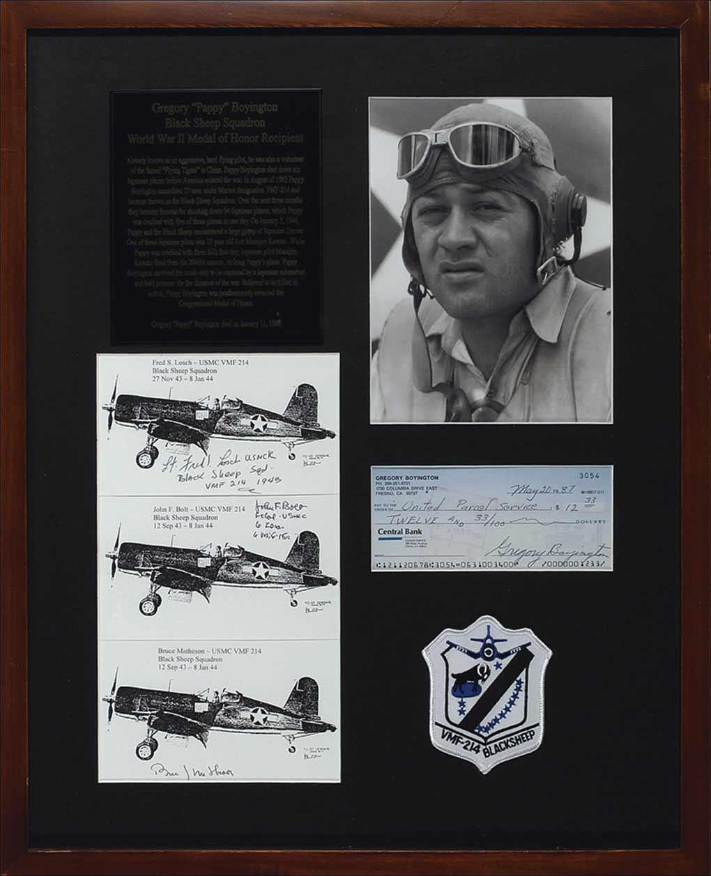 Personal check, 6 x 2.75, filled out and signed by Gregory ‘Pappy’ Boyington, dated May 20, 1987; and signatures of Fred S. Losch, John F. Bolt, and Bruce Matheson on individual off-white cards, bearing images of their respective aircrafts. All four items are matted and framed together with a biographical plaque, Blacksheep patch, and portrait of Boyington, to an overall size of 16.75 x 21. In fine condition, with a cancellation stamp to check.