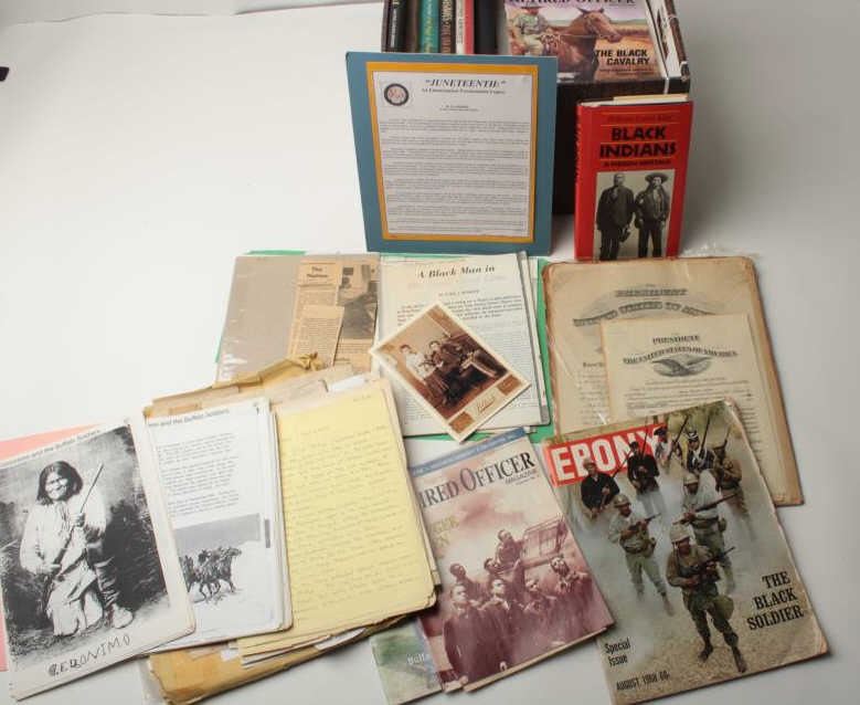 Black Soldier lot including framed color print of Black Cavalry members on horseback and a box of approximately 14 books, mostly on Black soldiers and units from various wars from the American Revolution to the World Wars; misc. magazines, afile of newspaper articles, etc. Est.: $200-$400.