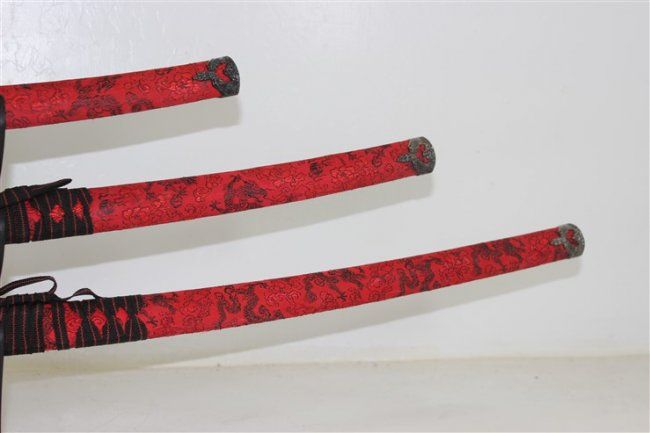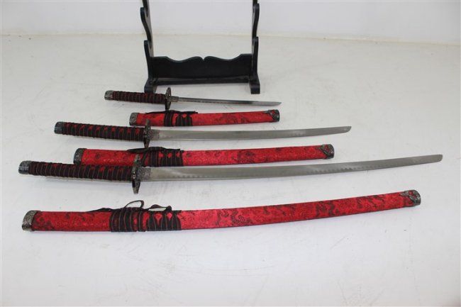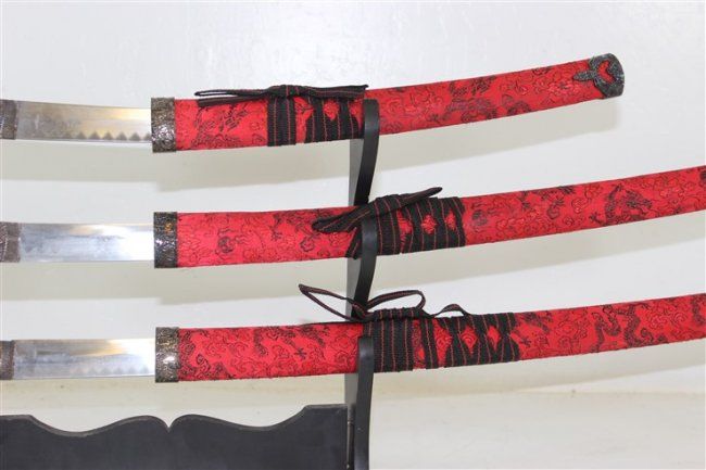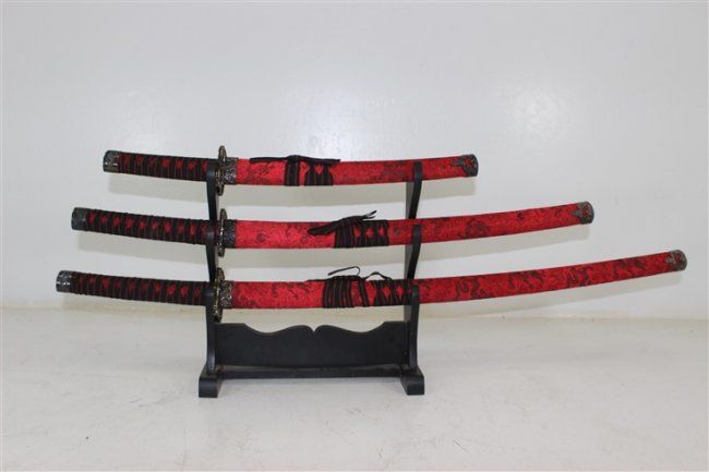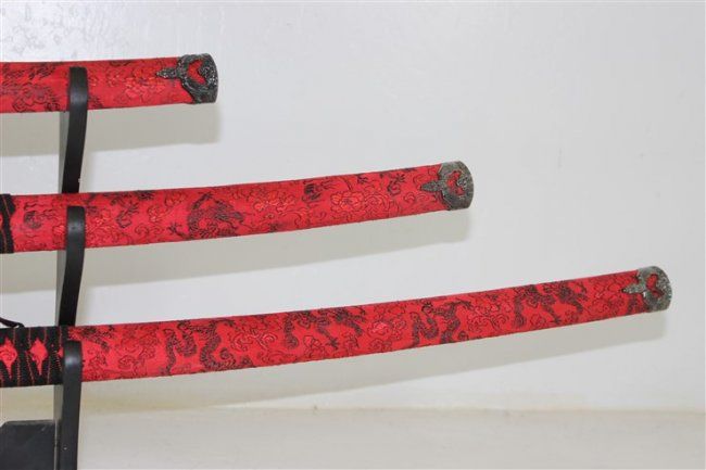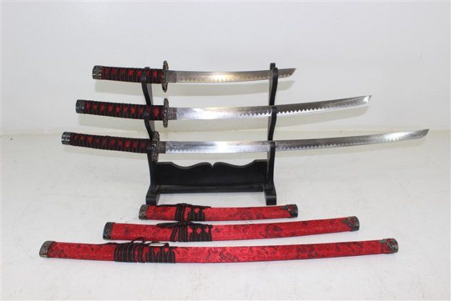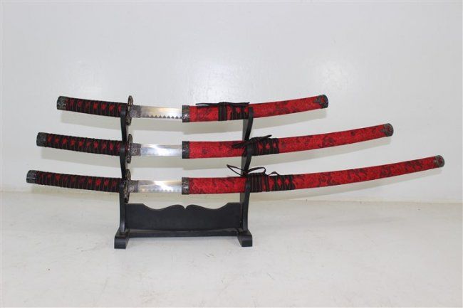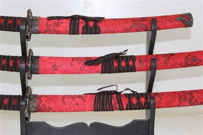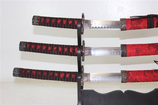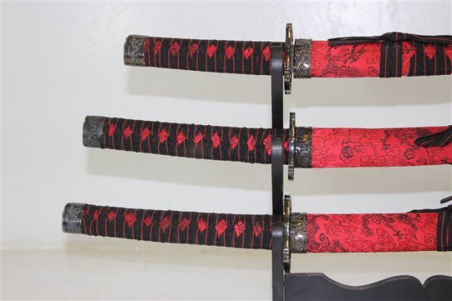 replica swords approx 40" l, medium sword approx 32", small sword approx 21 1/2", stand approx 13 1/2" tall x 13" wide x 5" deep