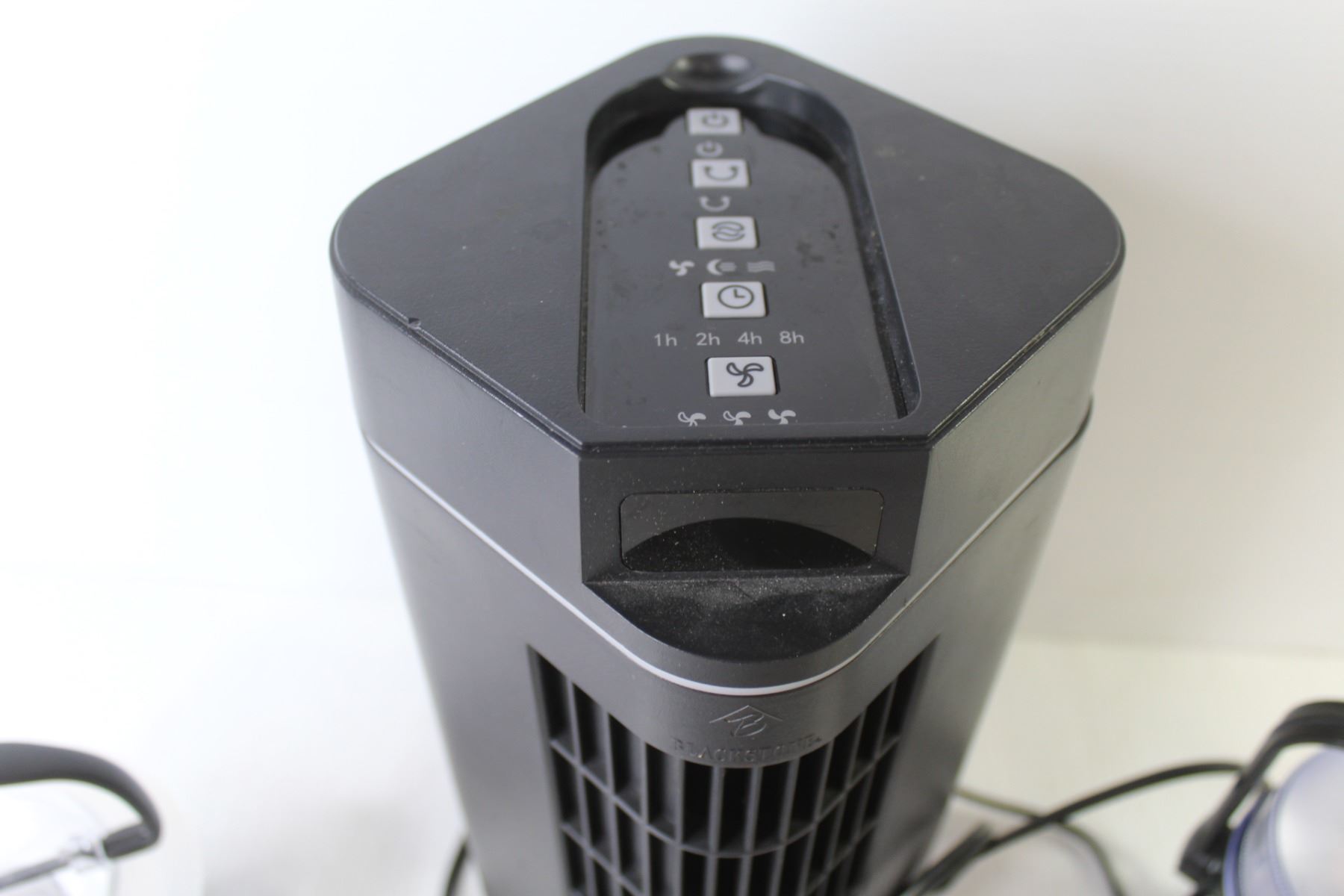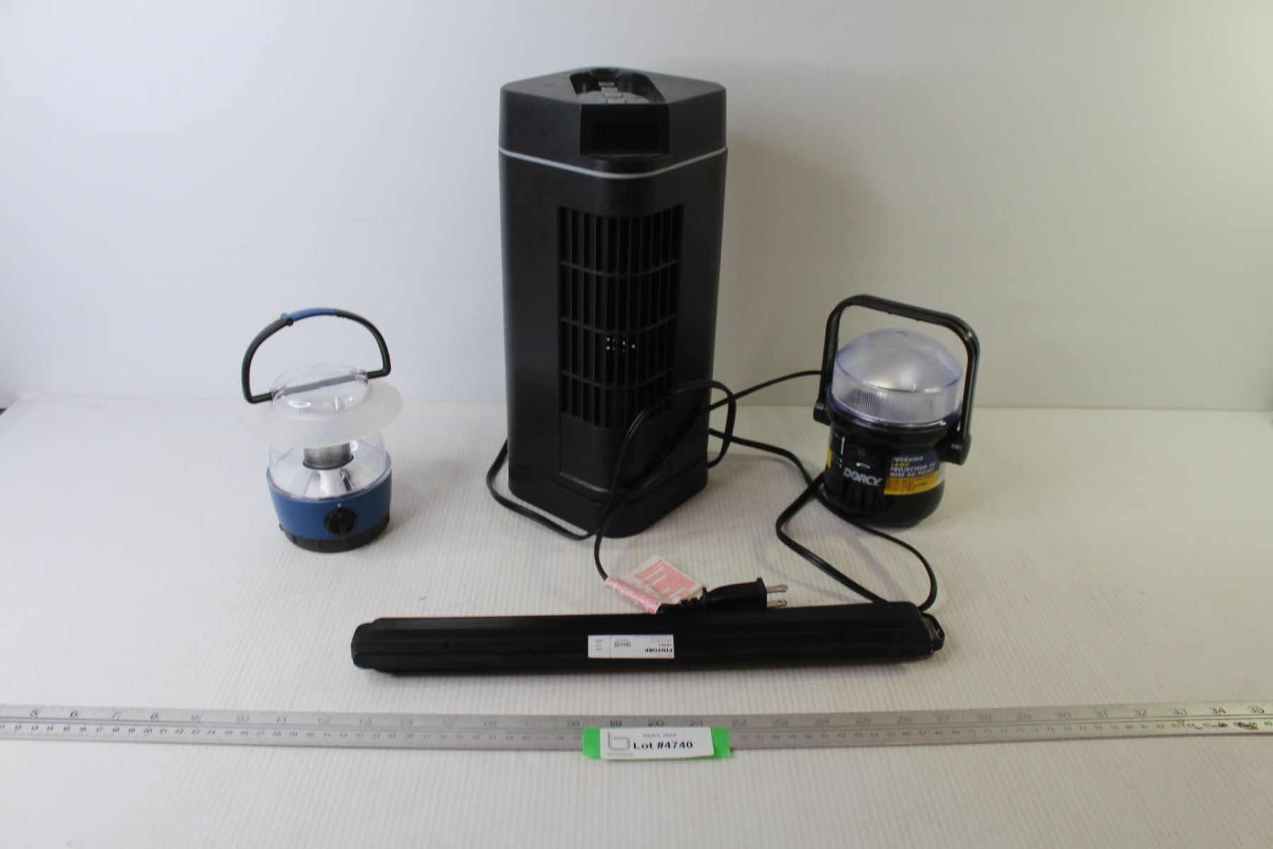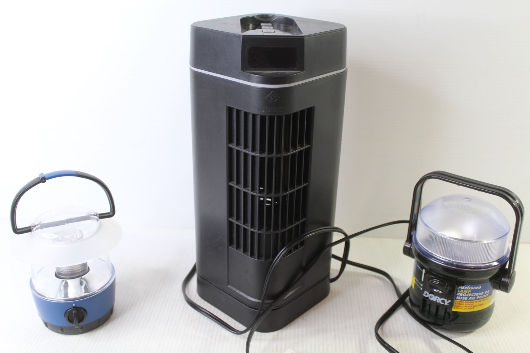 Black Stone Fan (has built in timer - powers on) - (2) Battery Lanterns (untested) - Drawer Slider?)